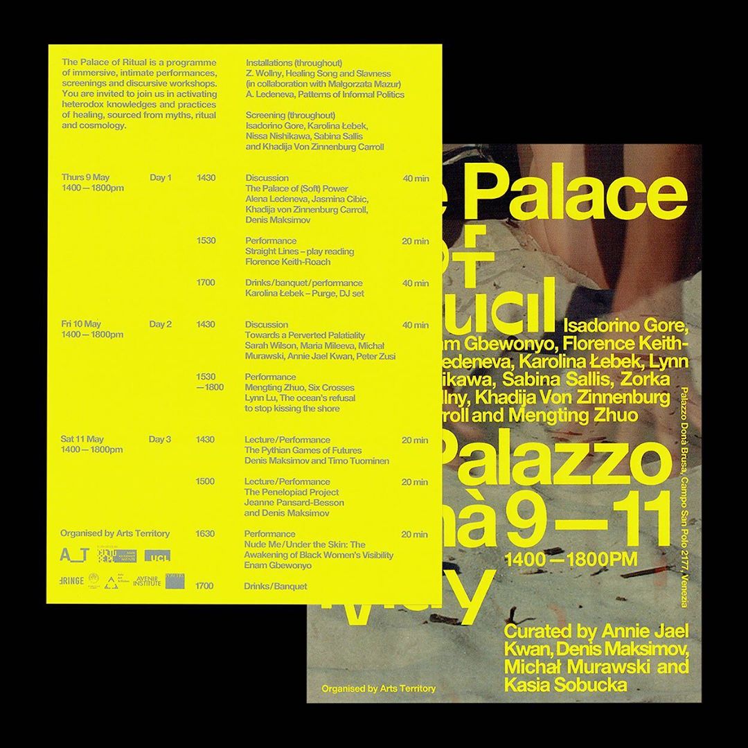 The Palace of Ritual Contributed by Benoît Bodhuin on Aug 27th, 2019. Artwork published in 2019. Source: www.instagram.com Our Place. License: All Rights Reserved. The Palace of Ritual is a programme of immersive, intimate performances, screenings, and workshops organised by Arts Territory and held during the Venice Biennale in May 2019. Designed by Our Place with Benoît Bodhuin’s Brutal, mixed with Neue Helvetica. Source: www.instagram.com Our Place. License: All Rights Reserved. Source: www.instagram.com Our Place. License: All Rights Reserved. Source: www.instagram.com Our Place. License: All Rights Reserved. Source: www.instagram.com Our Place. License: All Rights Reserved. Typefaces More about BrutalGet BrutalMore about Neue HelveticaGet Neue Helvetica Formats Posters/Flyers (5826) Topics Event (3259) Art (4744) Designers/Agencies Our Place (2) Tagged withVenice Biennale (42)workshops (138)performance art (93)screenings (36)programs (644)schedules (99)Arts Territory (1)stacked and staggered (410)yellow (405)type on an image (152)typeface combinations (3989)poster series (868)rotated type (2237)tight letterspacing (890) Artwork location Italy (982) Venezia (43) In Setscool (Karo Konieczna) (870)bb (Leonardo de la Fuente) (1331)fonts (yee jeon) (6) Post a comment Name Email – will not be published Website Your response Submit Comment More Brutal in use étapes: 2442018Léo PicoContributed by Benoît Bodhuin Skopje: Miasto, architektura i sztuka solidarności2019Aleksandra BraskaWeird GentlemenŁukasz PodolakContributed by Benoît Bodhuin 2019 calendar by Uncurated Studio2018Uncurated StudioKarl Adrian AguroContributed by Benoît Bodhuin Sponsor More in Art Sali e Tabacchi Journal, Riv.05, “La Via del Fuoco”2024Aisslinger PellegrinoContributed by Alex Lescieux How to Draw Sci-Fi Heroes & Villains2023unknownContributed by Bryson Stohr The Columbus Museum of Art2015BlackletterContributed by Patrick Crawford Tlatelolco Ciudad Museo by Erik López (ed.)2020Studio MugaErik LópezContributed by Studio Muga More in Posters/Flyers Conservatorio de Torrelavega branding2019Clara Briones VediaContributed by Clara Briones Vedia Staff Pick The Sunday Times posters1960Patrick TilleyContributed by Tânia Raposo Staff Pick Literatur im Volkspark 2022 and 2023c. 2022Thea KleinhempelContributed by Giulia Boggio On Paper Festival2016Giuliana TammaroContributed by Gareth Hague More Fonts In Use We Won’t Stand for the Flag Until the Flag Stands for the People posterc. 1970Bill StettnerContributed by Stephen Coles Staff Pick Gardulac Gin2024Davide MosconiAndrea MastrolucaFederico LandiniContributed by VJ-Type Staff Pick Texas Monthly, “The 50 Best BBQ Joints 2021” web page2021Emily KimbroVictoria MillnerDarice ChaviraContributed by Jamie Otelsberg (OH no Type Co.) Staff Pick UCLA Summer Sessions1997Sean AdamsAdamsMoriokaContributed by Sean Adams Staff Pick