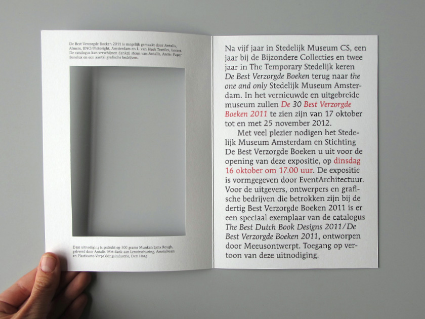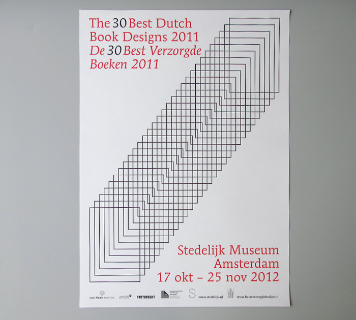 De Best Verzorgde Boeken is an annual competition that awards the best book designs from The Netherlands. For 2011, the jury selected 30 books out of 338 submissions. The winning entries were on display at the Stedelijk Museum Amsterdam in autumn 2012. Meeusontwerpt designed the catalogue as well as the poster and invitation for the exhibition.