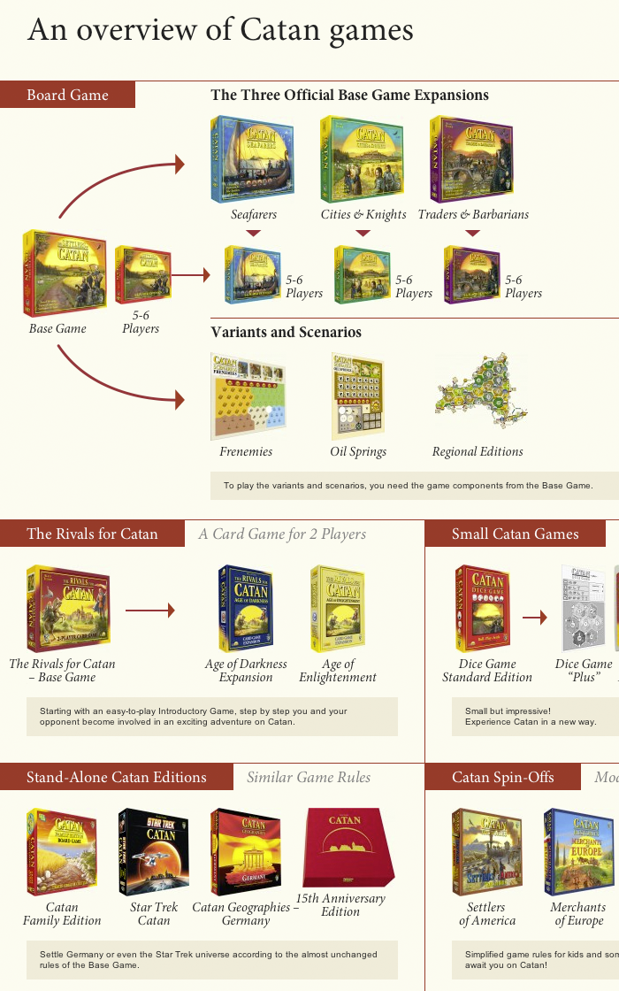 The Settlers of Catan is a multiplayer board game conceived by Klaus Teuber and first published in 1995 in Germany as Die Siedler von Catan. Its continued popularity has led to the creation of a great many spinoff games and products.