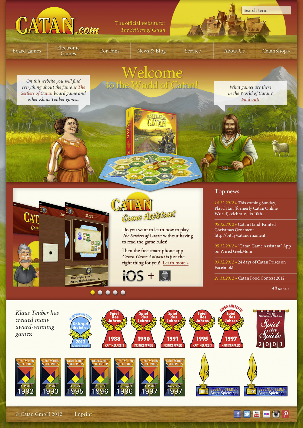 Catan.com is the official platform for all things Catan. Minion Pro (Robert Slimbach, 1990/2000) is used throughout the website. Four styles of the all-purpose serif are served via Typekit. Most of the text is set in the Roman and, surprisingly often, the Italic. The Bold is reserved for subheadings, while the Bold Italic apparently has been included “just in case”. For very small copy, the design resorts to Arial.