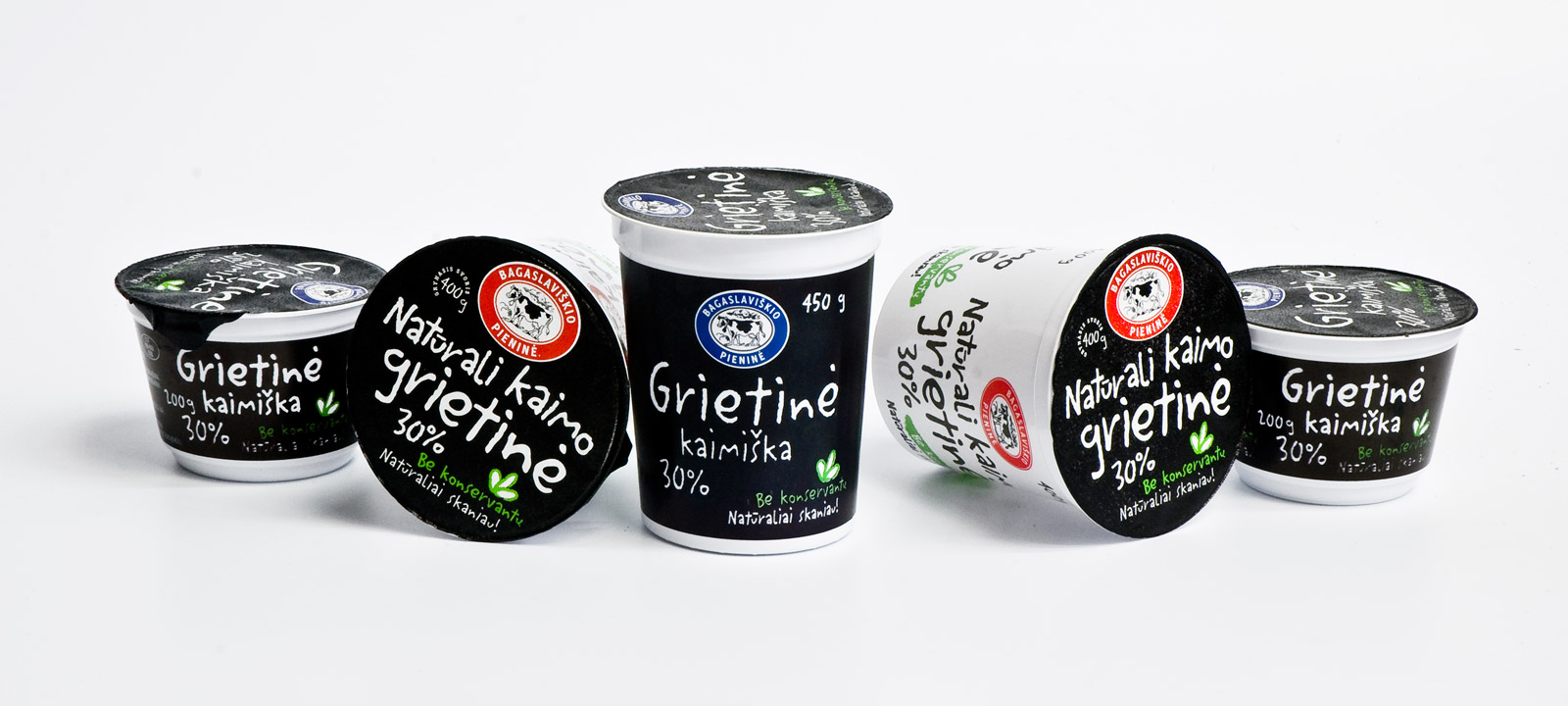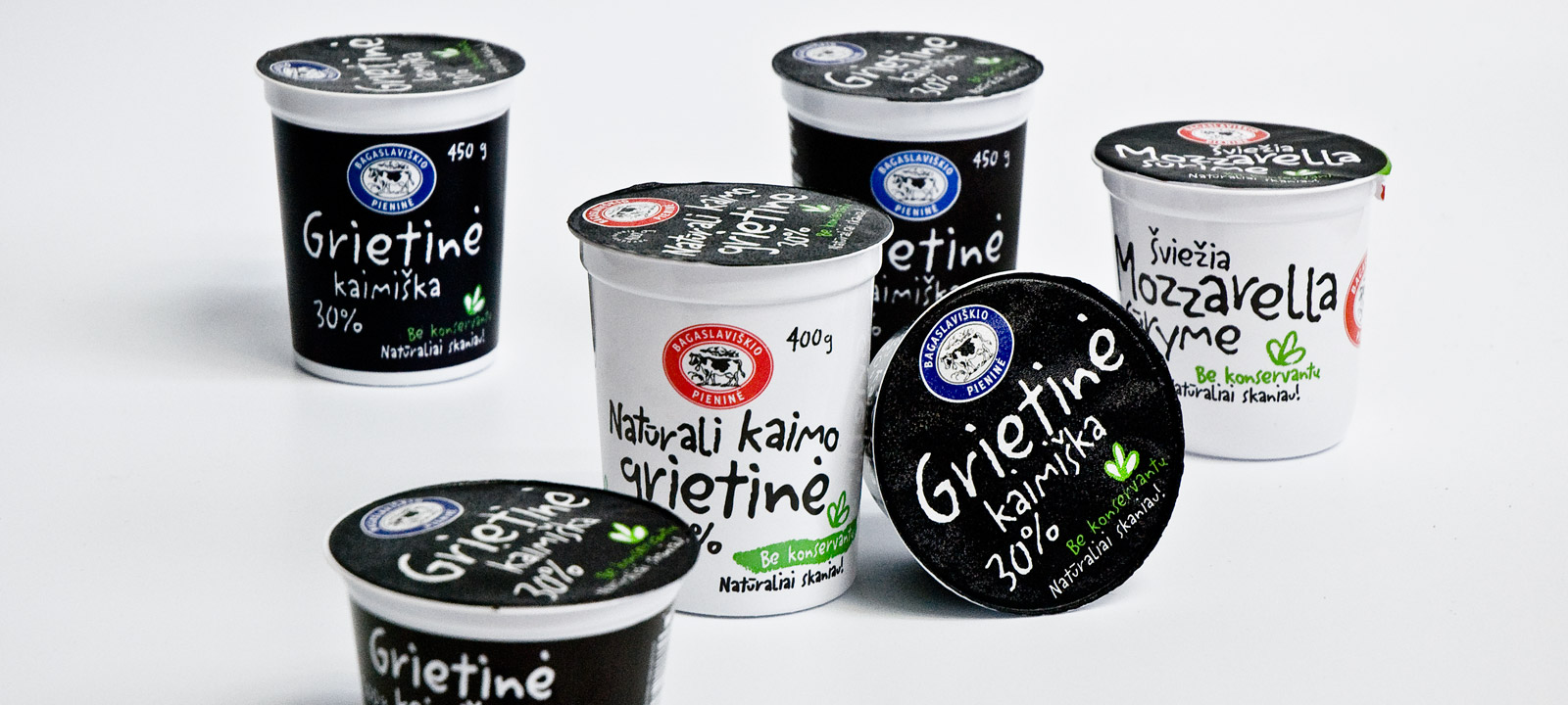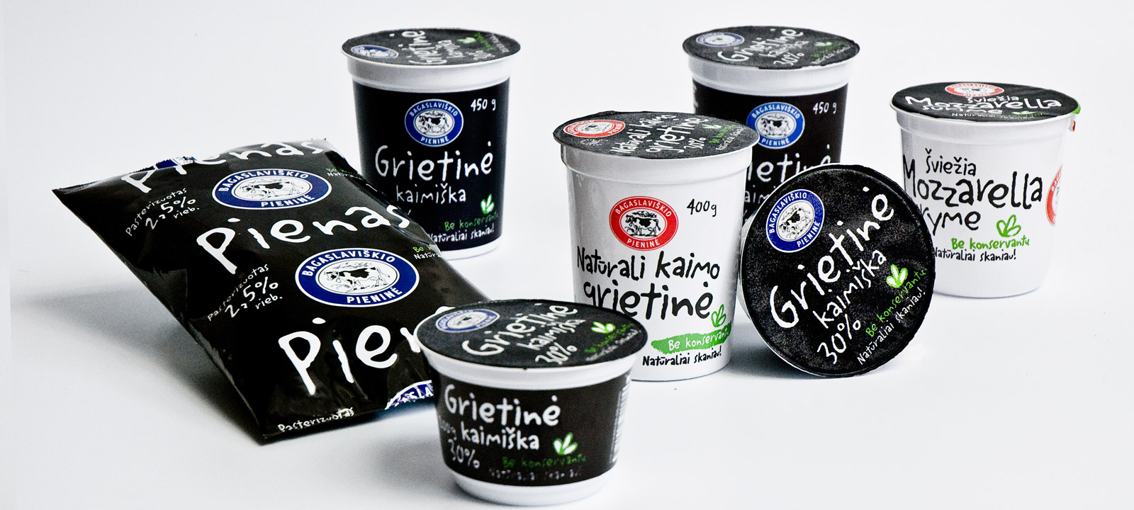 Studio Libre from Vilnius, Lithuania, redesigned the packaging for Bagaslaviškio, a manufacturer of dairy products. They went for a typeface that simulates naïve hand lettering, with rough-edged letters that seem to dance on the baseline. Litterbox was designed in 1995 by Dean Stanton for Image Club. As the retail version of Litterbox does not cover all the accented characters that are needed for Lithuanian, I assume that a custom extended font was created for the job.