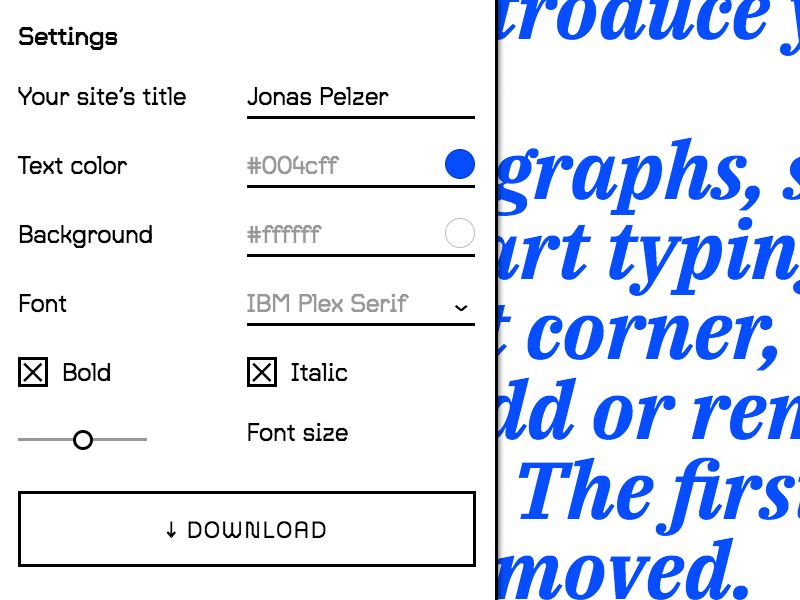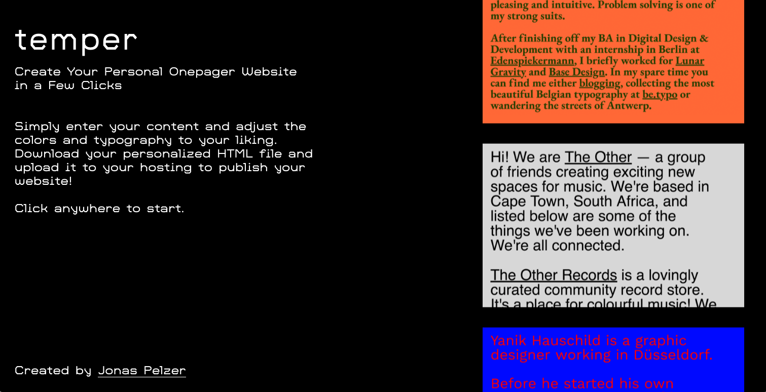 Temper Contributed by Jonas Pelzer on Sep 8th, 2019. Artwork published in 2019. Source: temper.jonaspelzer.com Photo: Jonas Pelzer. License: All Rights Reserved. Temper is a tool to build text-based one-page websites. The animated logo and the interface use Scope in different styles. Source: temper.jonaspelzer.com Photo: Jonas Pelzer. License: All Rights Reserved. Source: temper.jonaspelzer.com Photo: Jonas Pelzer. License: All Rights Reserved. Source: temper.jonaspelzer.com Photo: Jonas Pelzer. License: All Rights Reserved. Source: temper.jonaspelzer.com Photo: Jonas Pelzer. License: All Rights Reserved. Typefaces More about ScopeGet Scope Formats Web (5513) Topics Graphic Design (2952) Technology (1458) Designers/Agencies Jonas Pelzer (7) Tagged withvariable fonts (203)tools (30)software (93)interactive (105)web development (79)single page websites (193)uses by the typeface’s designer (1239)only type (1253)web apps (43) Artwork location Germany (3787) Berlin (1123) In SetsSci Fi (Sarah Brown) (8)Unique Font (Studio C u b e Y) (155)Tech (Sarah Brown) (15)brand (Antonio De Oliveira) (10)Rising Climate Justice (Jake Pilgrim) (257) Post a comment Name Email – will not be published Website Your response Submit Comment More Scope in use villeville.co2025Ville KansanenContributed by Jonas Pelzer Saphi website2022unknownContributed by Jonas Pelzer Infinite Colours documentary2024Hassan RahimGustavo EandiContributed by Jonas Pelzer Sponsor More in Graphic Design Ansichtssache – Über Lesbarkeit und die Details in der Typografie by Sabrina Öttl2017Sabrina ÖttlContributed by Love Lagerkvist Staff Pick Bold Typographic Prediction2012CoudalContributed by Stephen Coles “Lure et compagnie”, Rencontres de Lure 20232023mini studioContributed by mini studio Contramateria2025SabbathContributed by NaN More in Web Snaps and Rye websitec. 2014Contributed by Webtype Kair2016KmzeroContributed by Studio Kmzero Eighth Day2021Underline StudioContributed by Production Type Madein websitec. 2014Contributed by Webtype More Fonts In Use What to the Slave is the Fourth of July?1852Lee, Mann & Co.Contributed by Nick Sherman Blog Bayerische Staatsoper posters 2013–20142013Bureau Mirko BorscheContributed by Tânia Raposo Staff Pick Inside Llewyn Davis newspaper ad2014unknownContributed by Stephen Coles Staff Pick 22º Bienal Sesc_Videobrasil2024Luciana FacchiniFlávia CastanheiraContributed by Luciana Facchini Staff Pick
