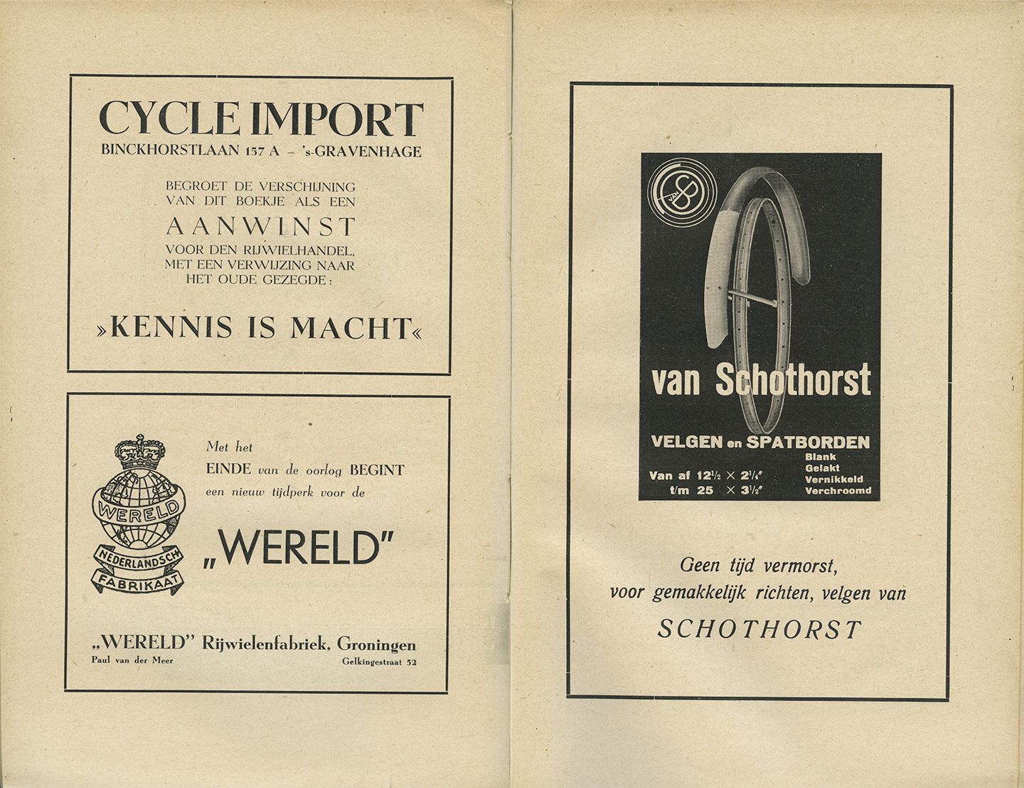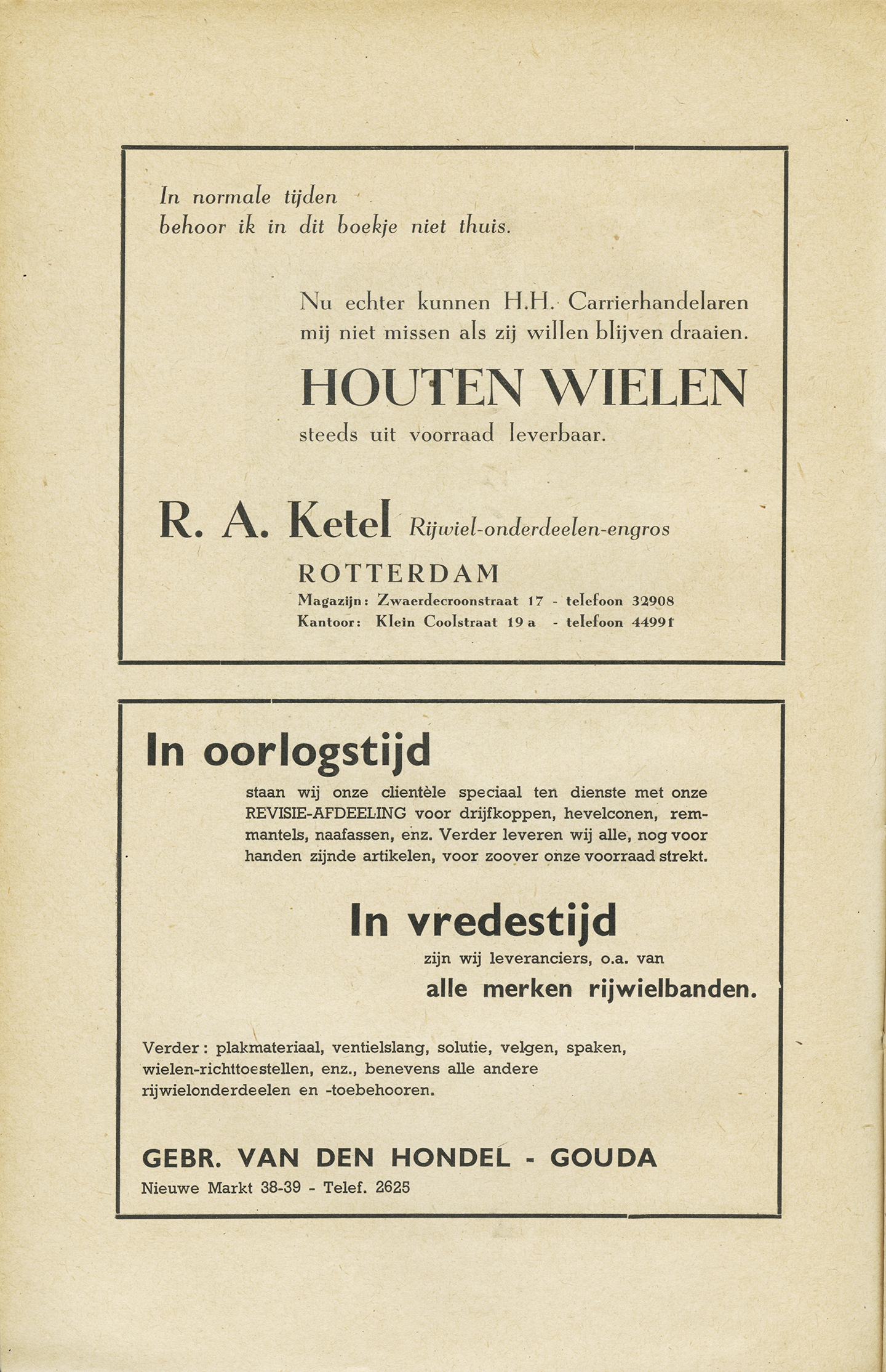 The booklets are not dated, but some of the ads mention both what they have on offer currently, and what they will have in stock once the war is over. This makes it likely that the books were issued between the winter of 1944 (when half of the Netherlands were liberated from the Nazi occupation) and the end of WWII in the Netherlands on May 5, 1945.