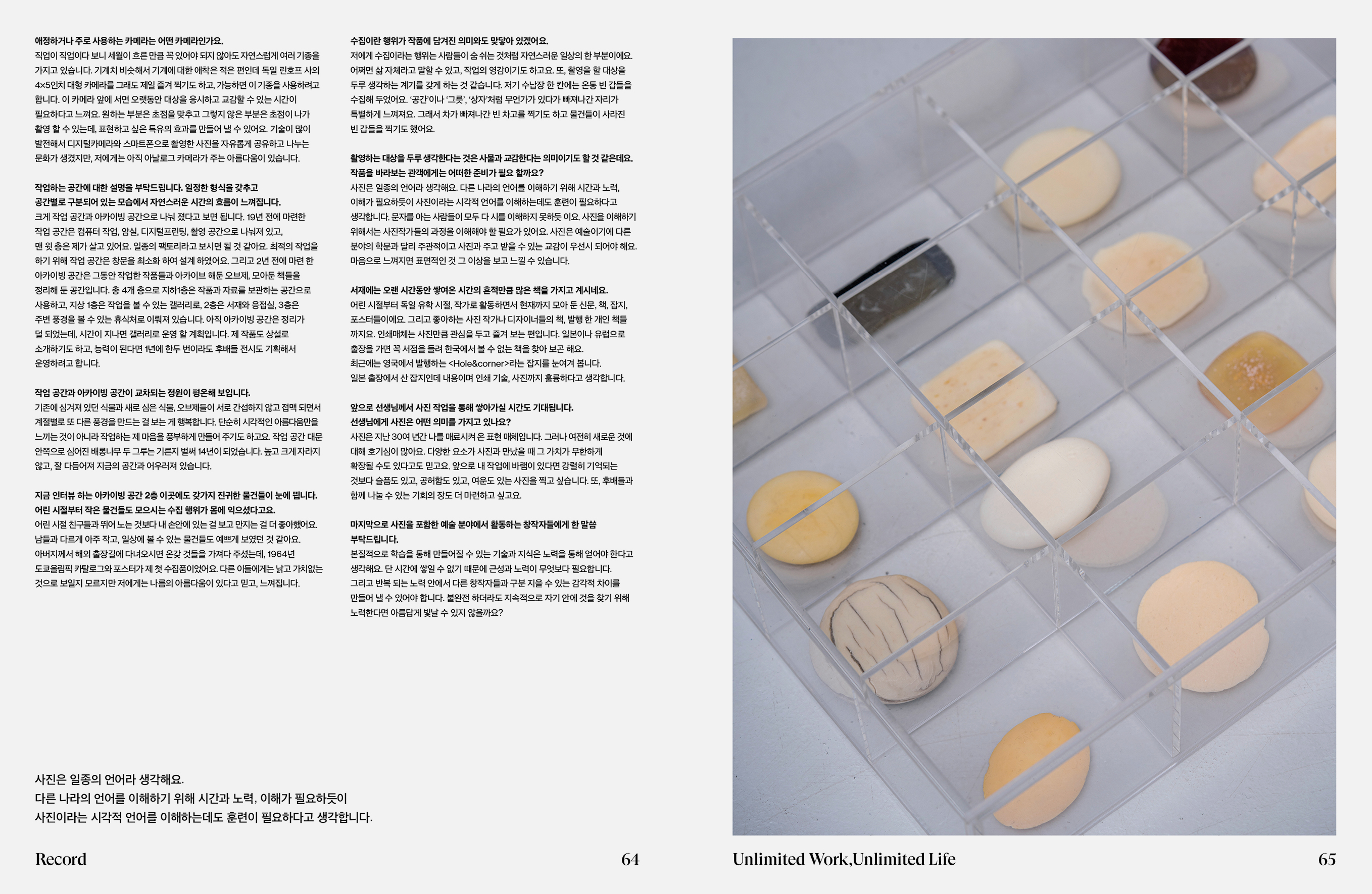 Issue 39 is about workplaces where creators like artists, designers, or photographers make something meaningful. In this issue, we used a number of different fonts to reflect the diversity of workplaces. Likewise, the texts and images have a wide spectrum. We chose each font to adequately express the character of the topic.