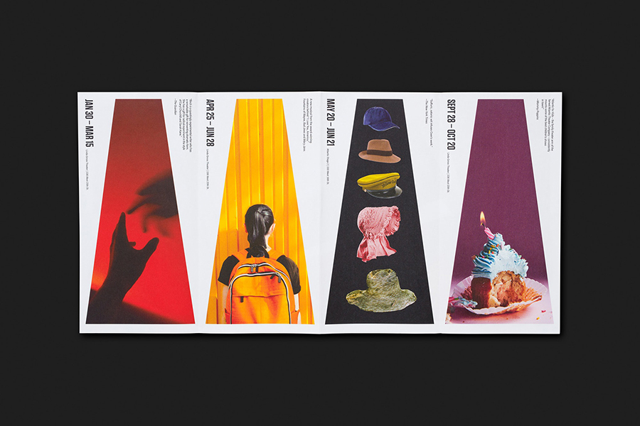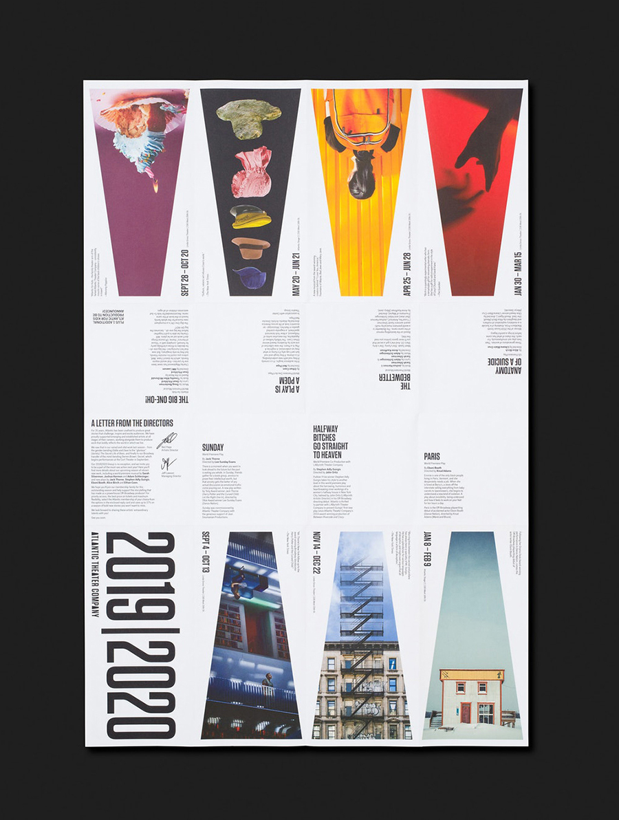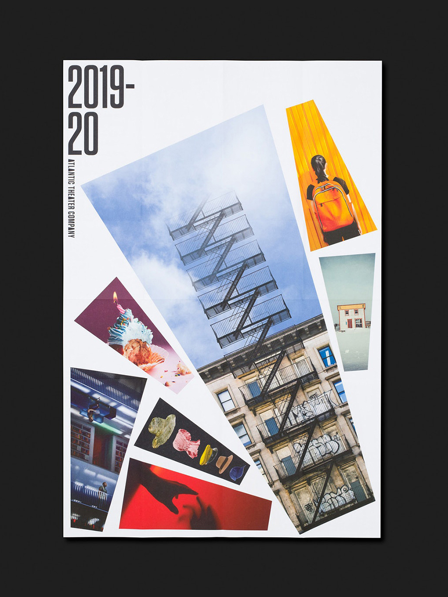 This bold and original voice was central to the design of the theater’s visual identity back in 2015. The first iteration was a visually loud mix of Hoefler&Co’s Tungsten, red and blue ink, an iconic spotlight/megaphone-like A, a postmodern freedom from formal grids and the overprinting of type and shape. Designed by Pentagram partner Paula Scher, and reconfigured between seasons, this has been a striking and recognizable foundation of the theater’s communications. Having designed the campaign identities for 2017–18 and 2018–19 Paula Scher returns to design the campaign for the 2019–20 season, introducing photography for the first time and a new material component.