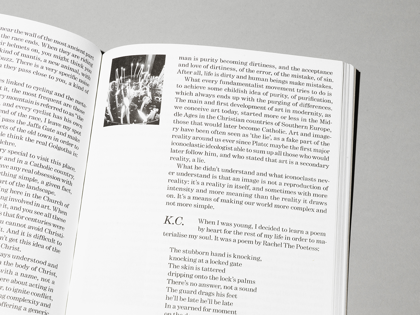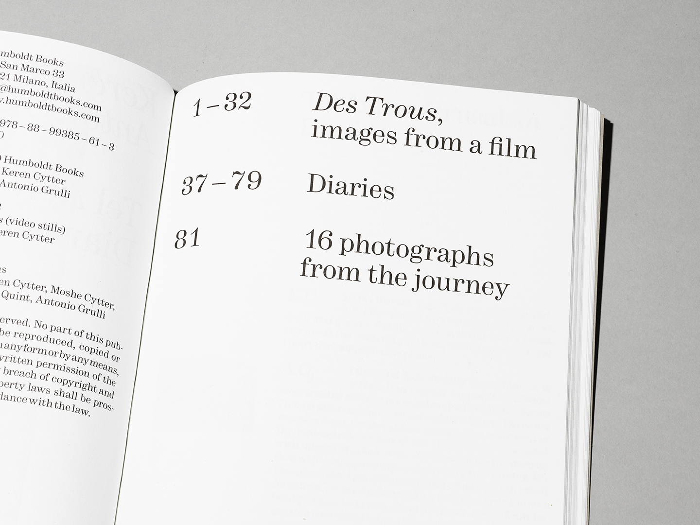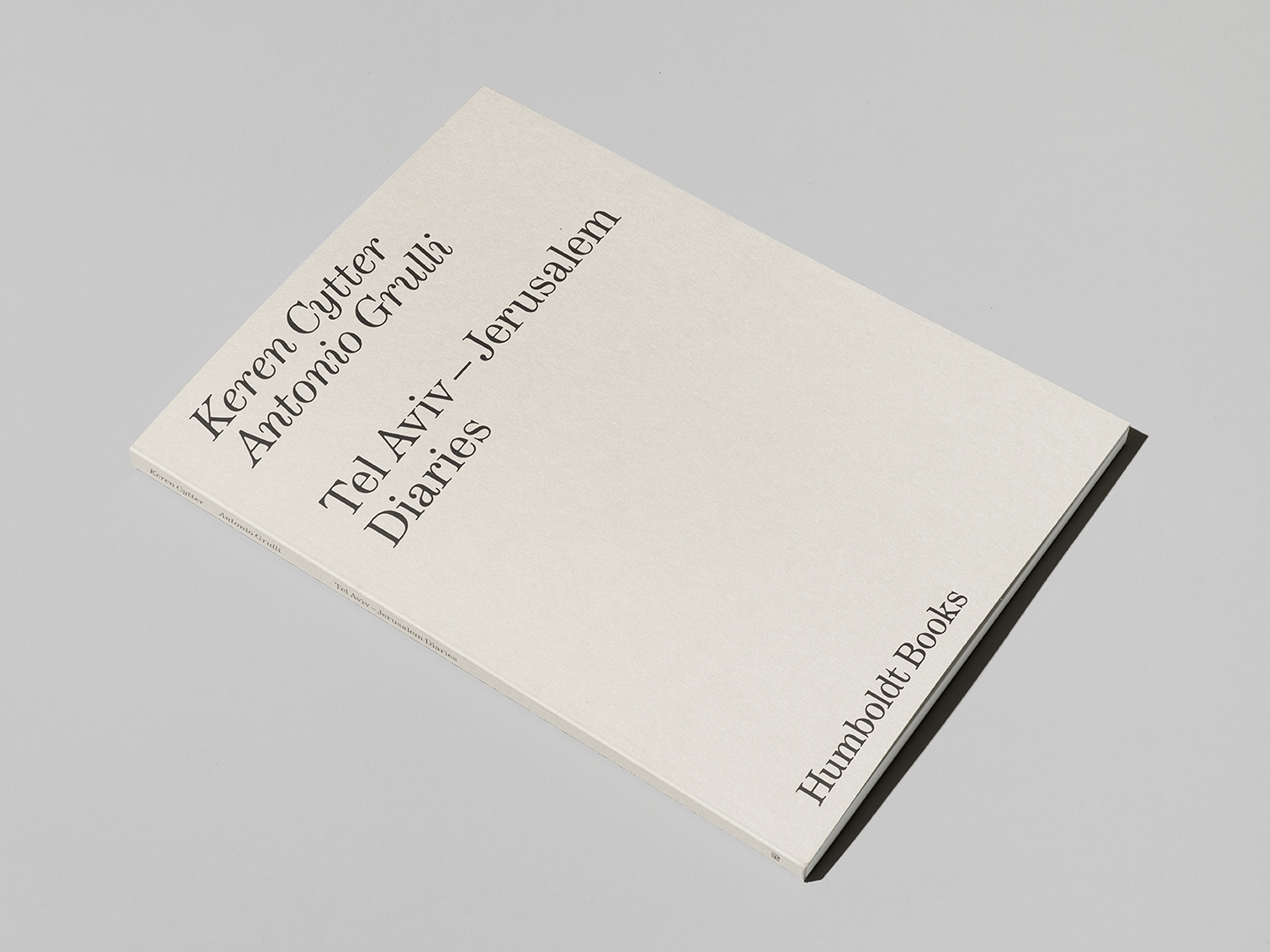 Tel Aviv – Jerusalem Diaries is a book made up of two books. The first is the diary of a journey embarked upon in the spring of 2018 by the artist Keren Cytter and the art critic Antonio Grulli. Destination: Tel Aviv and Jerusalem, the capitals of an exceptional and anomalous country. It’s a diary written in two voices, in which text and imagery together weave a fabric of recollections and reflections that go far beyond the journey. For Keren Cytter, it’s a return to the land where she grew up but where she has not lived for some time; for Antonio Grulli it’s the discovery of places imagined for a long time and which provide the input for a range of considerations on Israel, Europe and art. The second book within the book is the screenplay of the film Des Trous (The Holes), the work that Cytter created during the journey in Israel. The film is closely linked to the artist’s recent life experiences: a mix of autobiography and fiction intertwining detachment and melancholy, contrasting feelings towards that universe of relations that no longer belongs to her in the same way.
