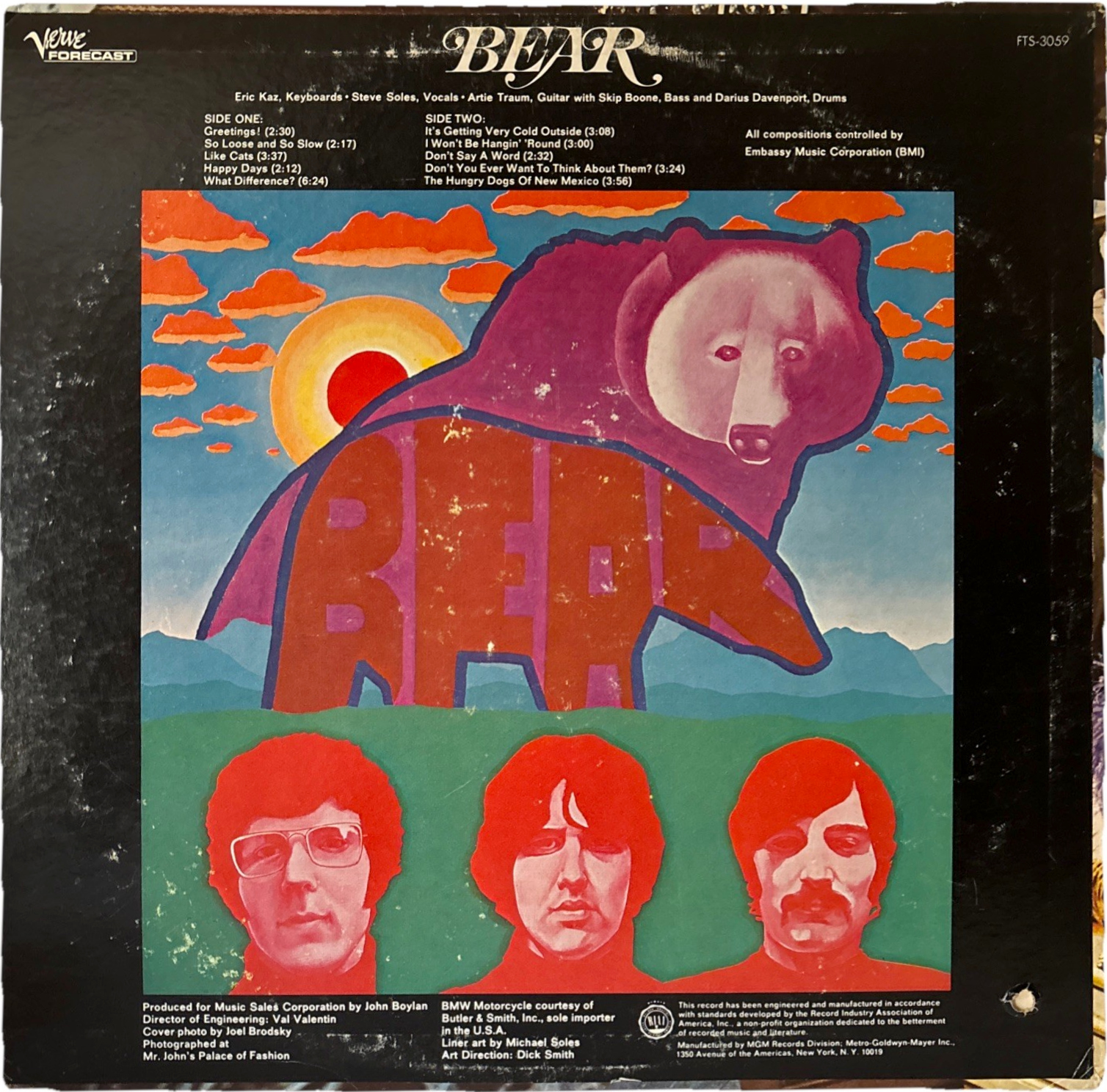 Bear was a psych rock band from Boston, originally called Children of Paradise. They recorded the theme music for Greetings, an early Brian De Palma film about young men avoiding the Vietnam War draft, starring Robert De Niro in his first role.
