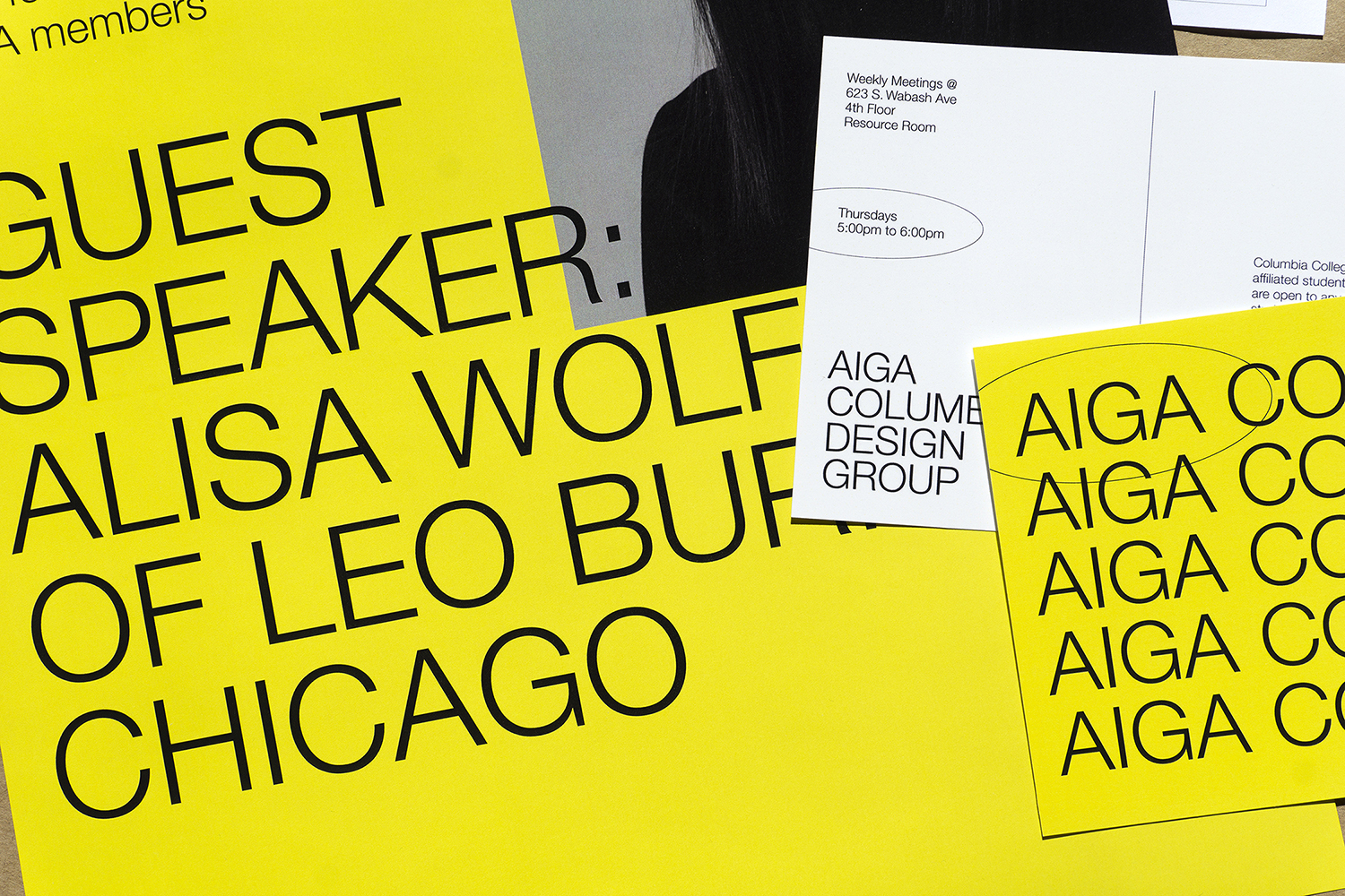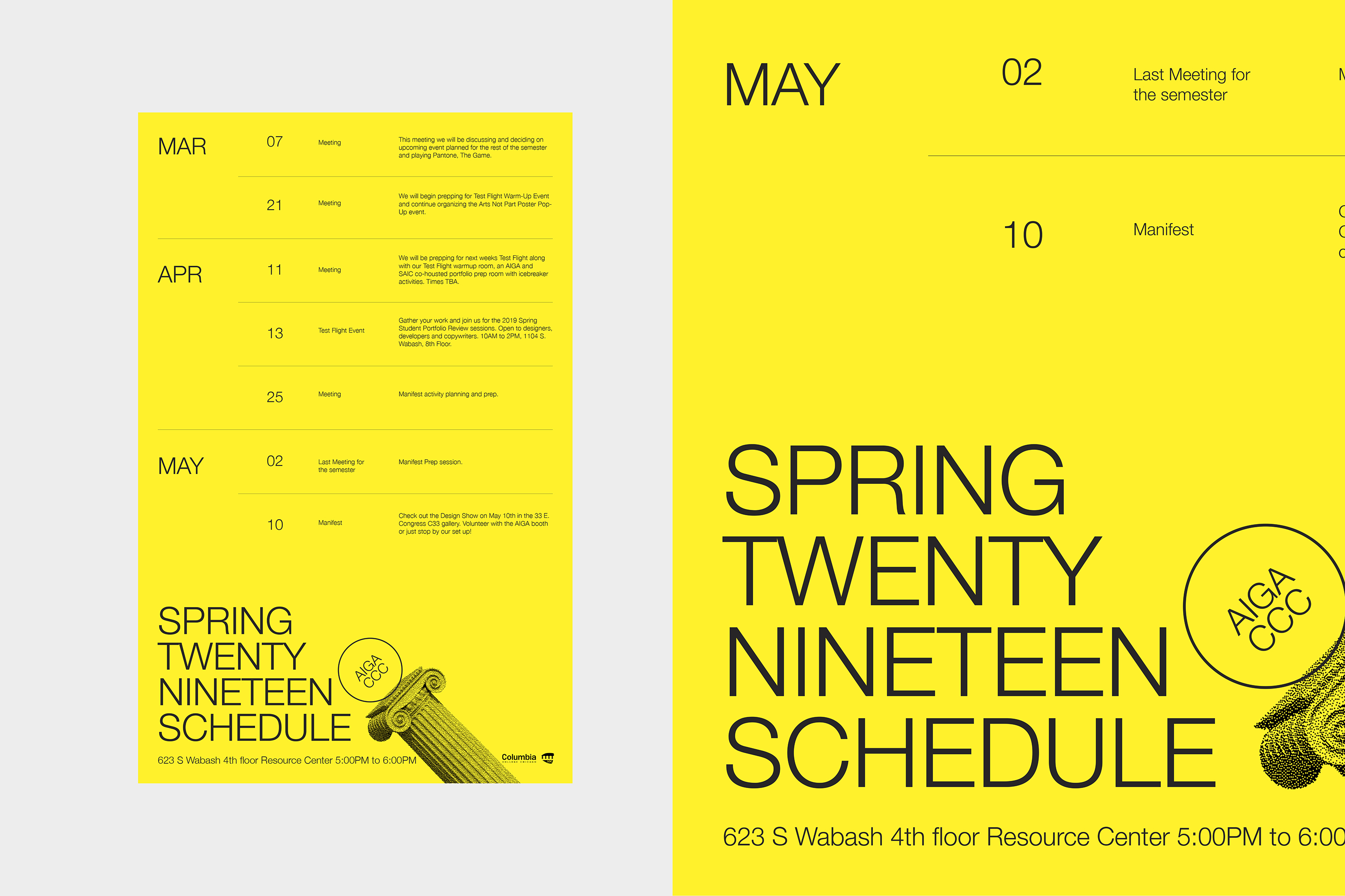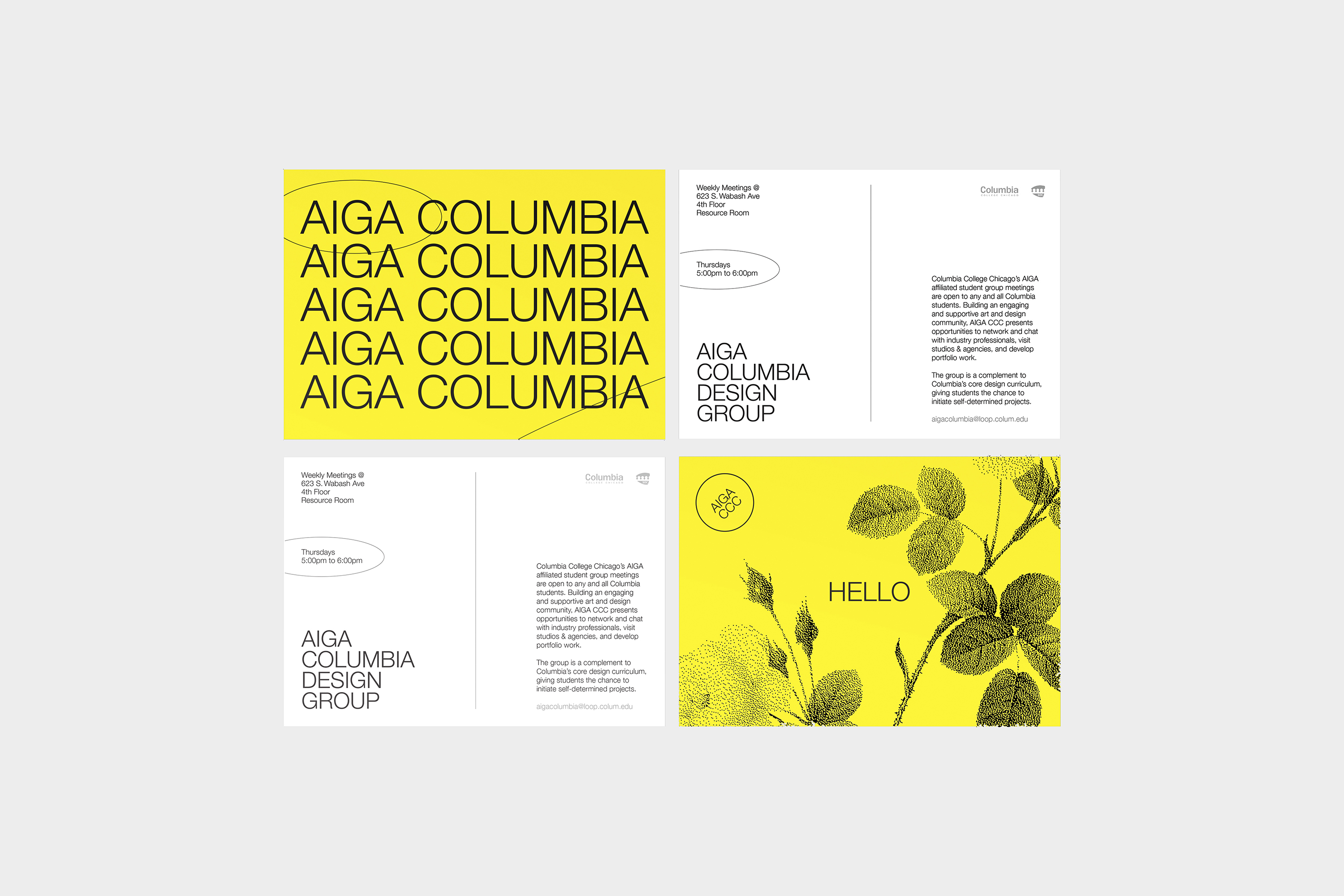 The bright yellow was chosen to stand out on the message boards full of other posters. Neue Helvetica is used in a light weight only to sort of lean into what was expected of a graphic design club branding and to stand out through simplification amongst the various other clubs and organizations advertised to students within school buildings.