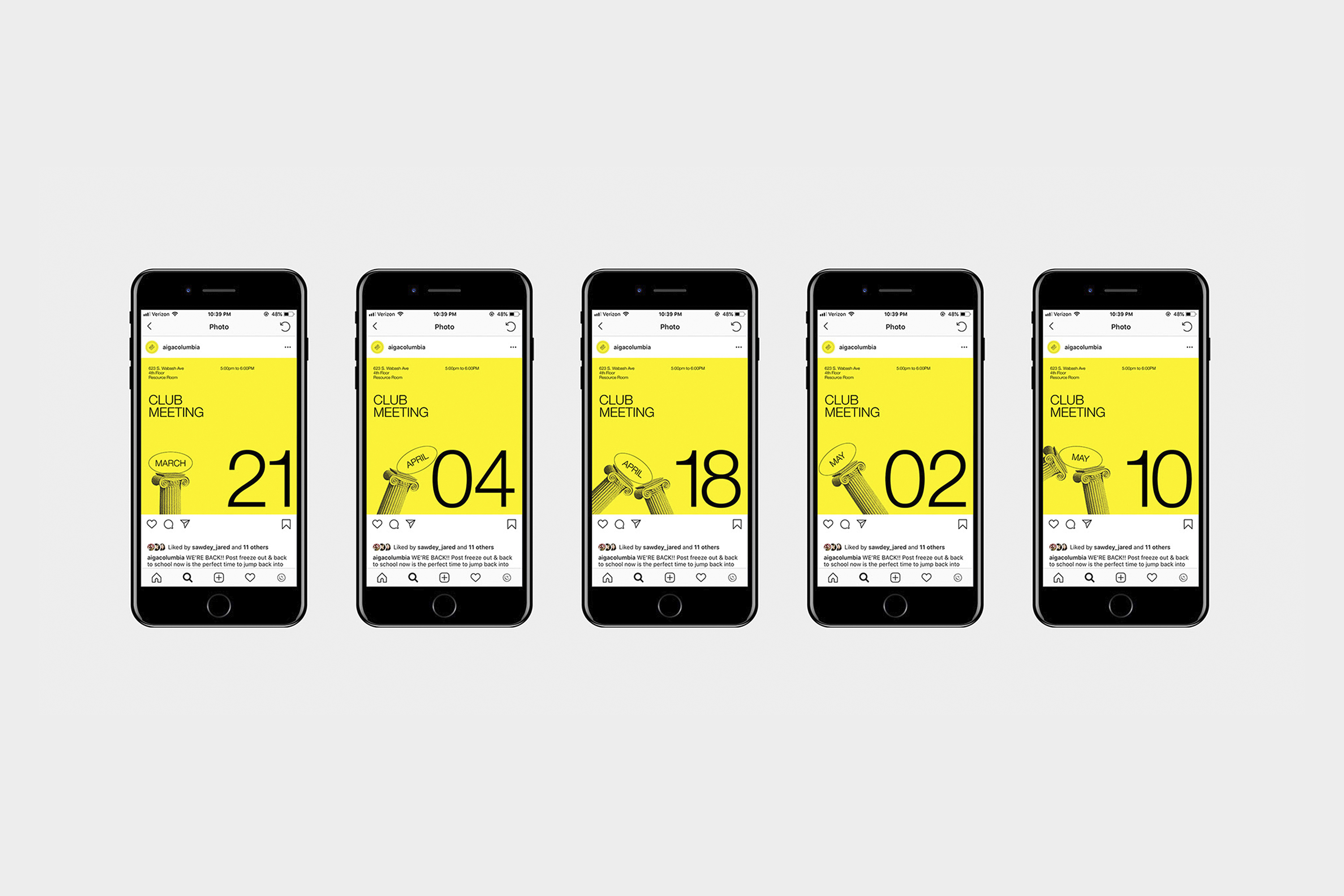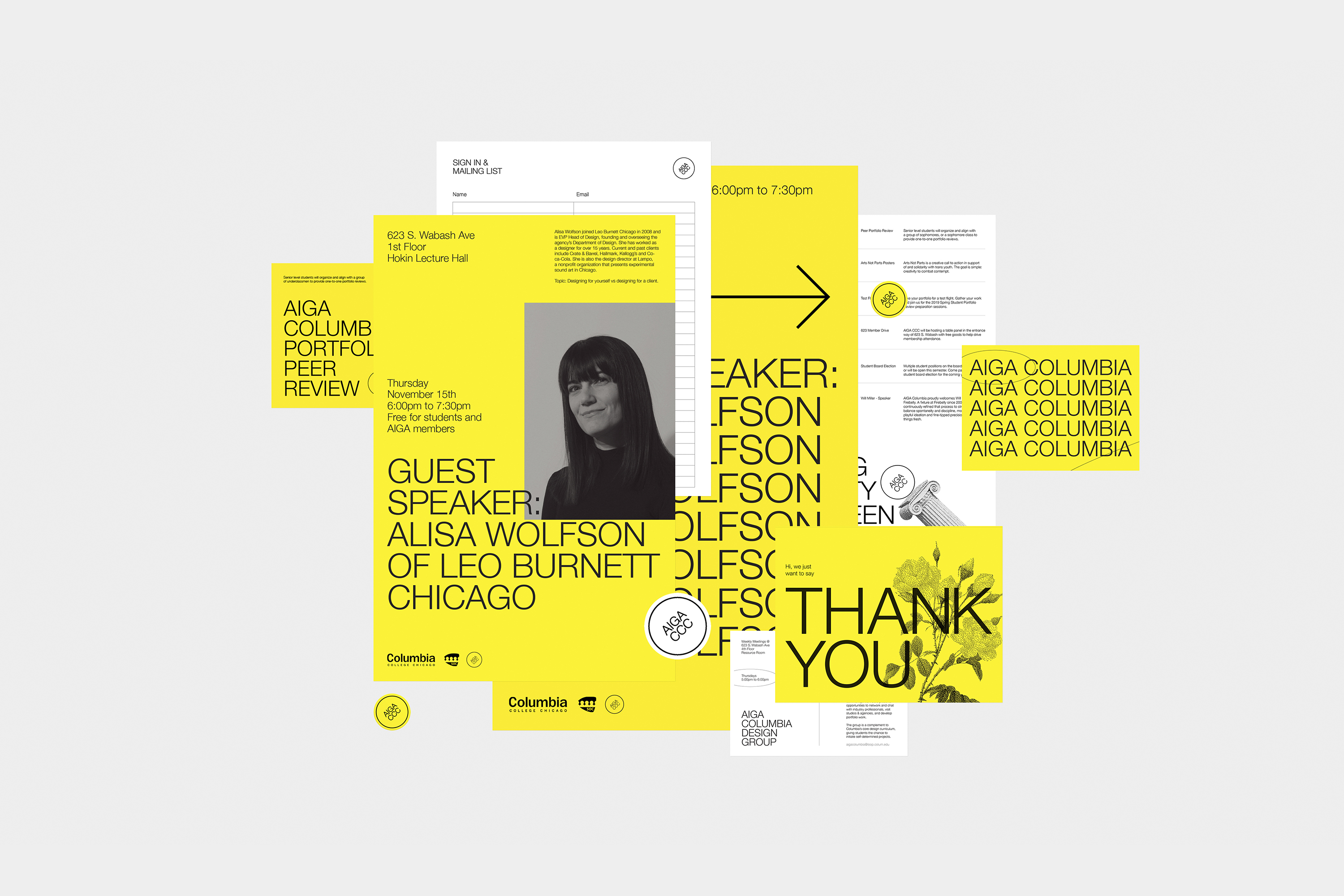 The AIGA Columbia identity was designed to be a consistent and constant brand for the AIGA affiliated group within Columbia College Chicago, with the goal of communicating the group’s seriousness to potential guest speakers and students in the college’s community. All the touchpoints were created to be easily replicated and templatized so the design system could be passed down to new leadership when the current group graduated over and over again.