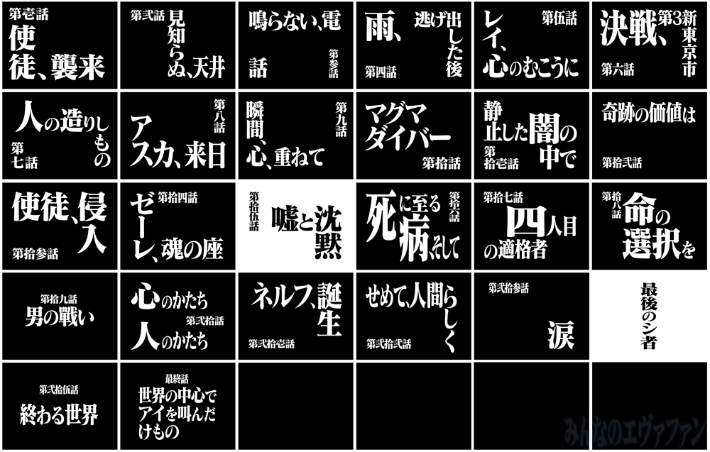 English title cards for the 26-episode TV series and The End of Evangelion, which contains two parts: “Love is Destructive” (alternative to Episode 25) and “I Need You” (alternative to Episode 26).