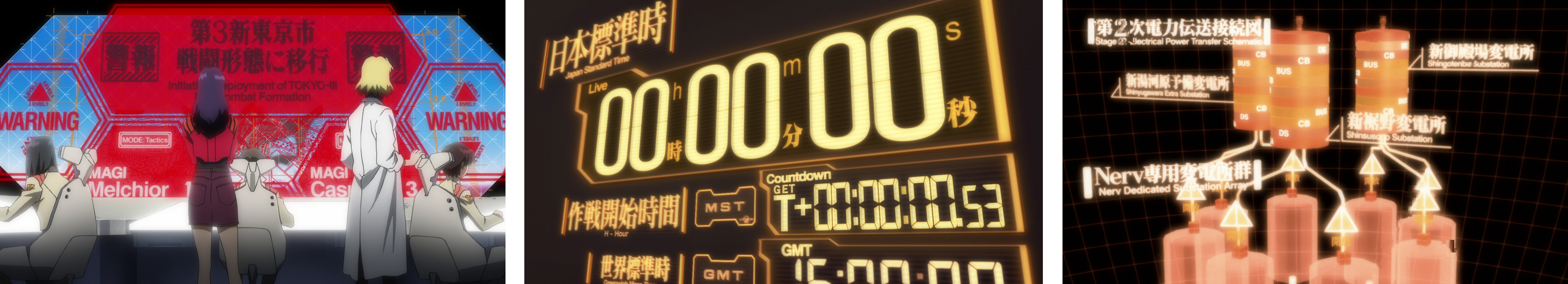 As the youngest typeface category, sans serifs have come to be associated with scientific and technological advancement. For example, Akzidenz-Grotesk often appears on Braun products under Dieter Rams’s direction, and Futura was chosen to represent humanity on the moon. Their unadorned letterforms conveyed the precision, progress, and optimism characteristic of mid-century modernism. Evangelion’s incorporation of Futura, Helvetica, and Eurostile in its visual world-building (especially when used for decorating Tokyo-3 and NERV) serves the opposite purpose, however. A last gasp after two presumably destroyed Tokyos, Tokyo-3 is a fortified underground city built to withstand giant monster attacks, its aboveground portion serving directly as a combat zone. Here, civic life gives way to heavy militarization. Civilization is on the brink of collapse, and humanity teeters on the edge of extinction. Futura and Eurostile do appear on objects in Evangelion that are as sophisticated and enormous as NASA rockets in real life—but while space exploration looks to the future with unending aspiration, Evangelion uses these typefaces to document the past and all of its unhealable trauma. In other words, the fact that typefaces like Eurostile and Futura are used in Evangelion as high-modernist signals offers an entry to a profound reflection on the collective human endeavor known as modernism by alluding to a world in which such endeavors were pushed to the limit, having already failed.