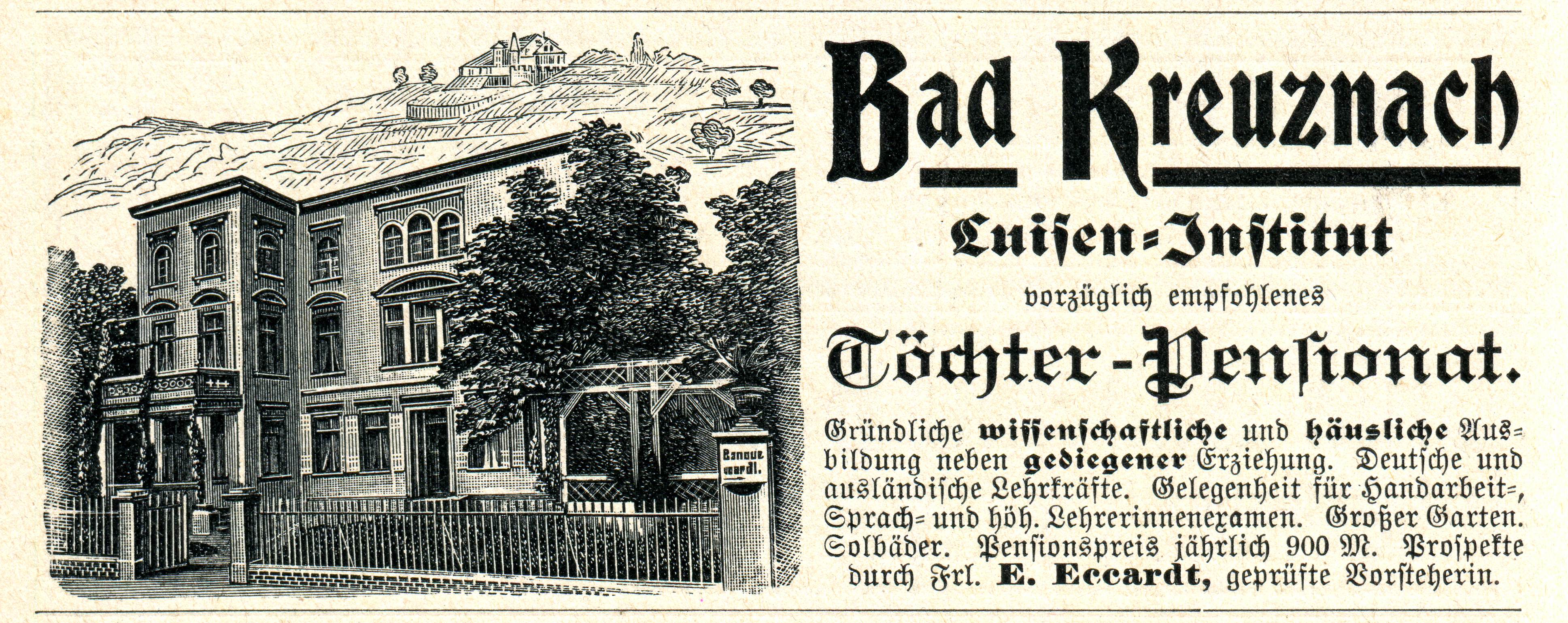 The one shown above is for the Luisen-Institut in Bad Kreuznach (then in the Kingdom of Prussia’s Rhine Province) – an “excellently recommended finishing school for daughters” offering “thorough scientific and domestic training in addition to solid education” with the “opportunity for exams in handicraft and language as well as higher teacher’s exams”. The annual fee of 900 ℳ included access to the big garden and brine baths.