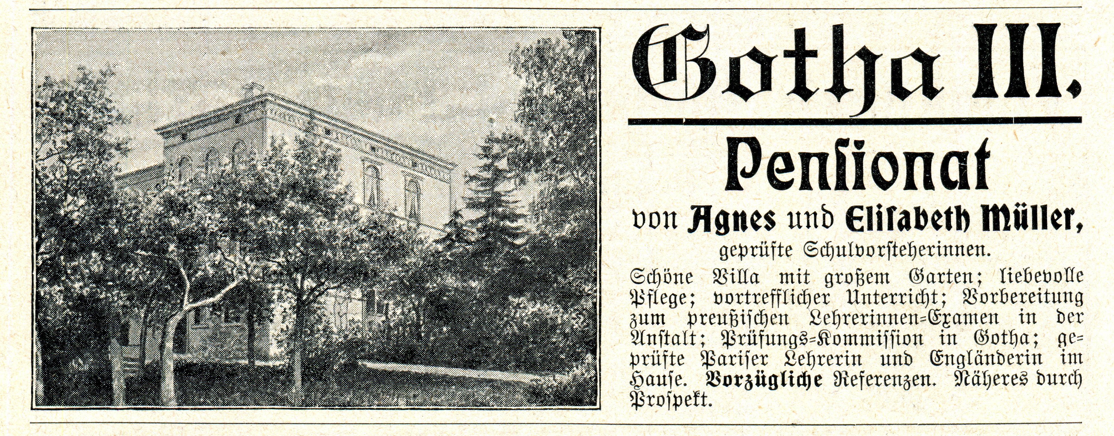 The advert shown below is for another Pensionat in Gotha (then part of the Duchy of Saxe-Coburg and Gotha). It plugs the “beautiful villa with big garden” and its “certified in-house instructors from Paris and England”, and promises “excellent teaching and preparation for the Prussian teacher’s exam”.