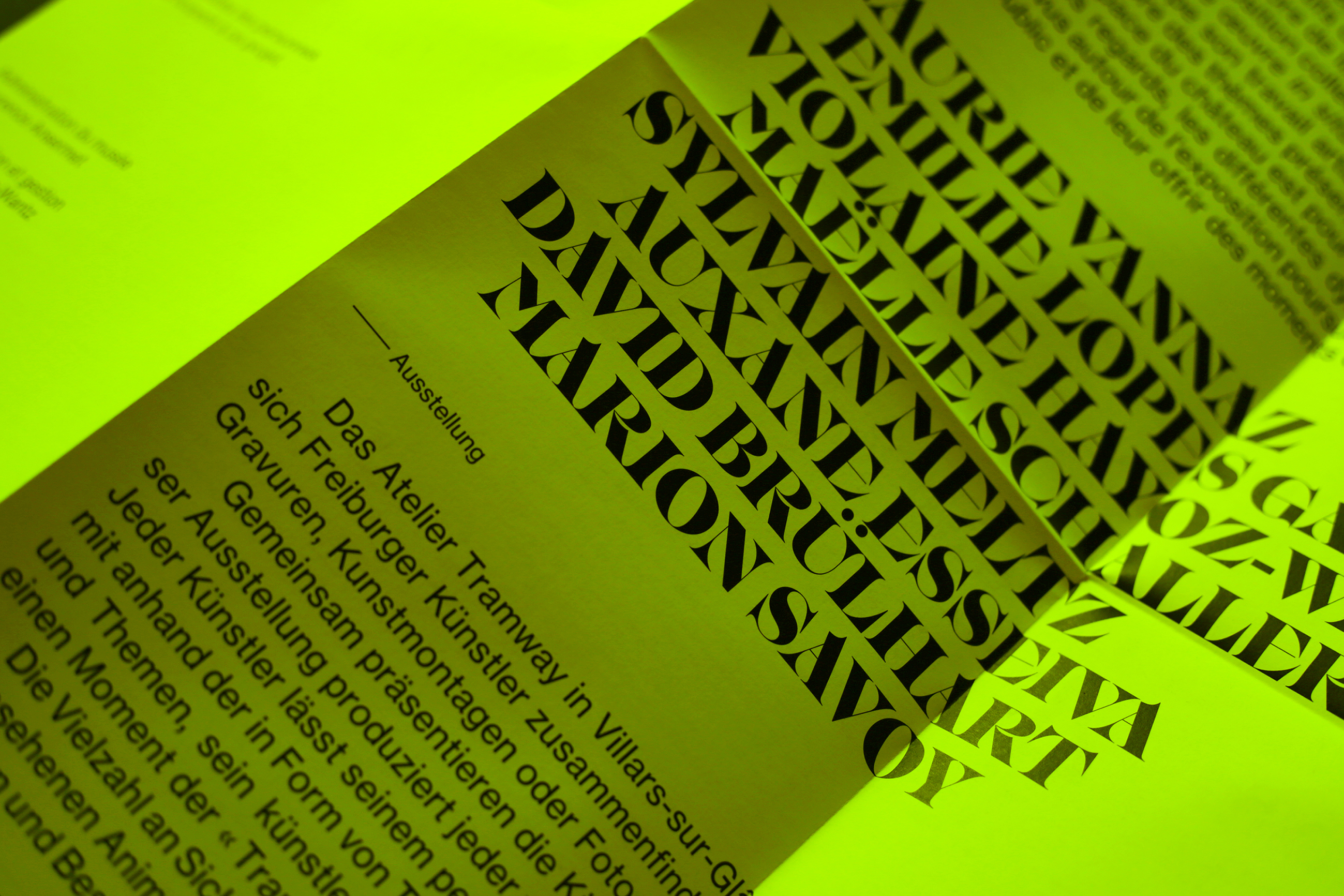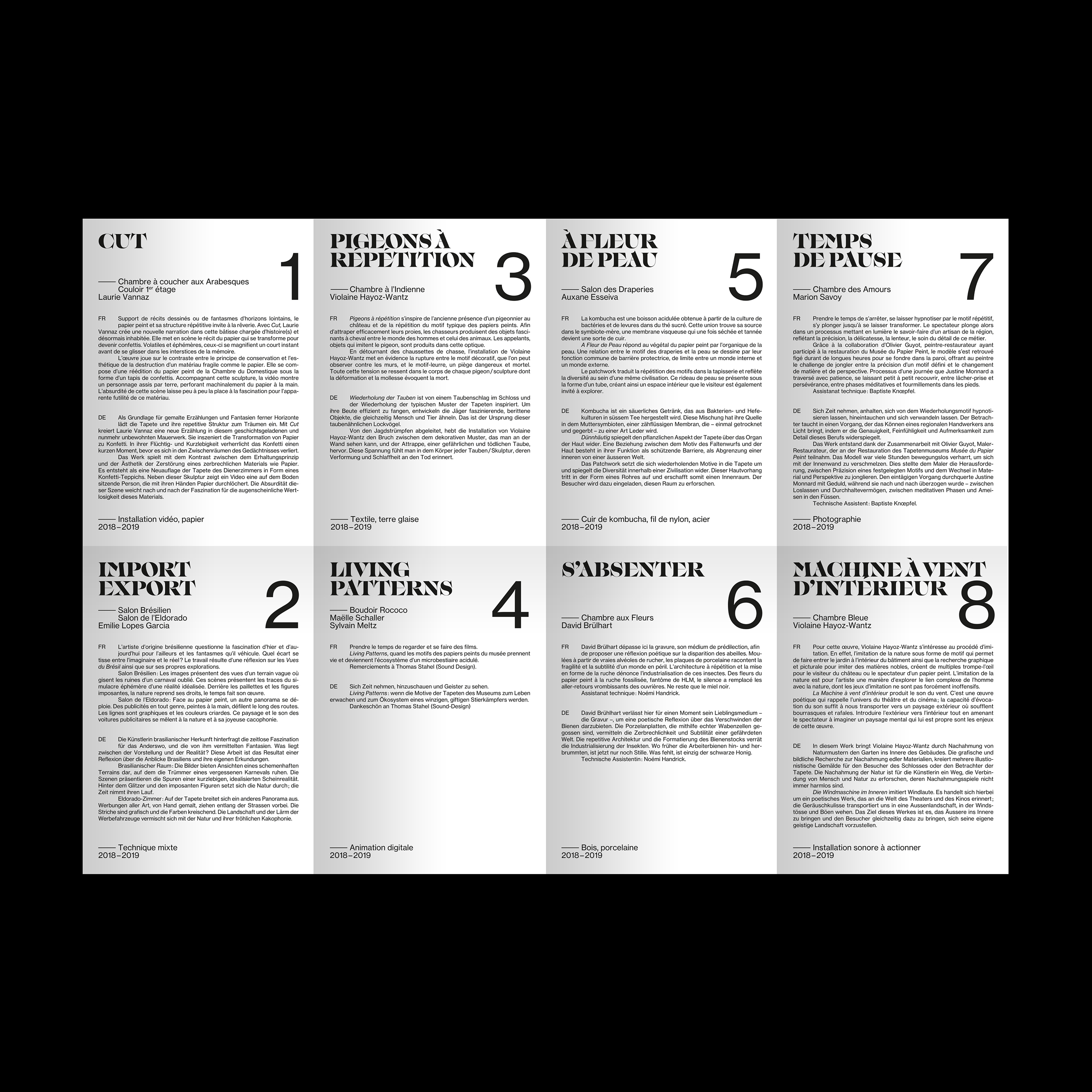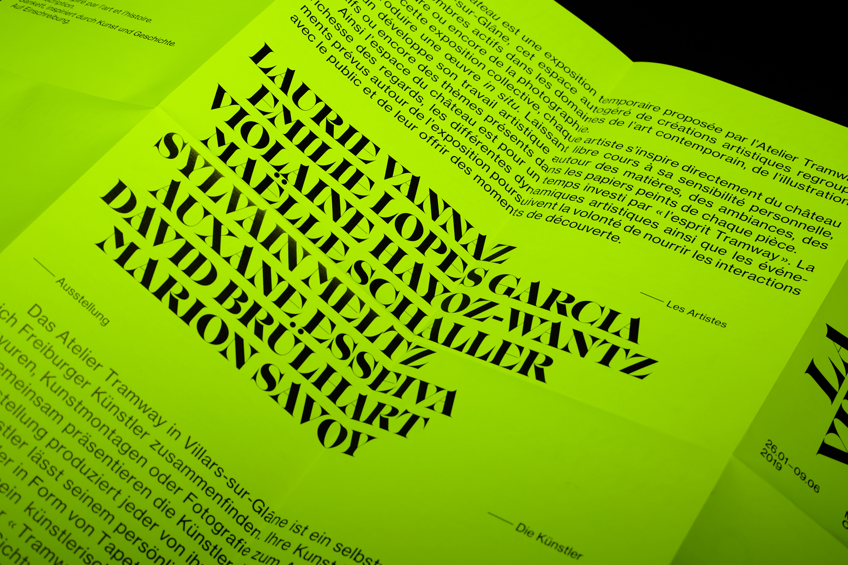 La Vie de Château / Das Schlossleben Contributed by Swiss Typefaces on Nov 6th, 2019. Artwork published in January 2019. Source: www.facebook.com © Atelier Tramway. License: All Rights Reserved. Swiss designer Vanessa Cojocaru designed an flyer/exhibition guide for La Vie de Château | Das Schlossleben, an exhibition displaying art pieces by the artist collective Atelier Tramway at the Wallpaper Museum in Mézières (Switzerland). The display typeface is IKANSEEYOUALL. Body text and informations are set in Neue Haas Grotesk. IKANSEEYOUALL is part of the Lab typefaces, available from Swiss Typefaces. Source: www.facebook.com © Atelier Tramway. License: All Rights Reserved. Source: www.facebook.com © Atelier Tramway. License: All Rights Reserved. Source: vanessacojocaru.com © Vanessa Cojocaru. License: All Rights Reserved. Source: vanessacojocaru.com © Vanessa Cojocaru. License: All Rights Reserved. Source: vanessacojocaru.com © Vanessa Cojocaru. License: All Rights Reserved. Source: www.facebook.com © Atelier Tramway. License: All Rights Reserved. Source: vanessacojocaru.com © Vanessa Cojocaru. License: All Rights Reserved. Source: vanessacojocaru.com © Vanessa Cojocaru. License: All Rights Reserved. Source: www.facebook.com © Atelier Tramway. License: All Rights Reserved. Typefaces More about IkanseeyouallGet IkanseeyouallMore about Neue Haas GroteskGet Neue Haas Grotesk Formats Posters/Flyers (5687) Topics Event (3165) Art (4618) Designers/Agencies Vanessa Cojocaru (2) Tagged withall caps (7478)neon/fluorescent/phosphorescent colors (223)yellow (400)folded (231)typeface combinations (3887)rotated type (2200)art exhibitions (849)only type (1268)yellow and black (469)two-color (997)multilingual (2581)French (language) (2493)German (language) (2479)stacked and staggered (393) Artwork location Switzerland (1108) Villars-sur-Glâne (1) Mézières (1) Fribourg (8) In SetsDesigns by Women (Fonts In Use Staff) (3512)modern (isabel) (57)störung (Salomé Salome) (41)Hot (jean-alexandre Jean) (106)Art World (Lucas Bevilaqua) (649)editorialx (Leonardo de la Fuente) (443) Post a comment Name Email – will not be published Website Your response Submit Comment More Ikanseeyouall in use Hauteville House guide2019Atelier PentagonContributed by Swiss Typefaces Type Life magazine #1, Special Lab (v2)c. 2018Swiss TypefacesContributed by Swiss Typefaces Le Mans 70 website2020Jamie RankinPerry HardingJamie BitmeadContributed by Jamie Rankin Sponsor More in Art Barbican Arts Centre2006Cartlidge LeveneStudio MyerscoughContributed by Stephen Coles Staff Pick Stedelijk Museum identity (2012)2012Mevis & Van DeursenContributed by Andreas Kofler Blog Barbara Koch in der Sammlung der Kunst Aus(leihe) Dortmundc. 2025Ten Ten TeamContributed by Ten Ten Team Super Paper issue 101, March 20182018Bureau Mirko BorscheContributed by Axel Pelletanche More in Posters/Flyers Théâtre Joliette, Season 2023/20242023Super TerrainContributed by Oudin Romain Hailu Mergia – Pioneer Works Swing (Live) album art2023Daniel KentCallum AbbottMei LenehanContributed by Eliott Grunewald Staff Pick Musée du Monde en Mutation posters2021Super TerrainContributed by 205TF DMJX identity and websitec. 2020Playtype FoundryContributed by Playtype Foundry More Fonts In Use New Images of Man1959Herbert MatterContributed by Stephen Coles Staff Pick The Belbury Circle – Outwards Journeys album art2017Julian HouseContributed by Florian Hardwig Staff Pick Jazz à Luz – 31eme Festival d’Altitude2022RovoBureau IndépendantContributed by Forgotten Shapes Staff Pick Press Press Campionario, issue 01: “Brush Folder 2014–2019”2020Michele GalluzzoContributed by Michele Galluzzo Staff Pick