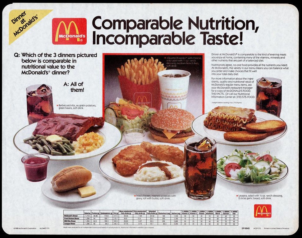 A tray liner distributed in restaurants in 1988 comparing the nutritional value of a Quarter Pounder combo with several other uncanny-looking American dinners, which might be technically true based on calories-by-volume, but come on (look at those fries!). I’m reminded of that Calvin and Hobbes strip about sugary cereal: