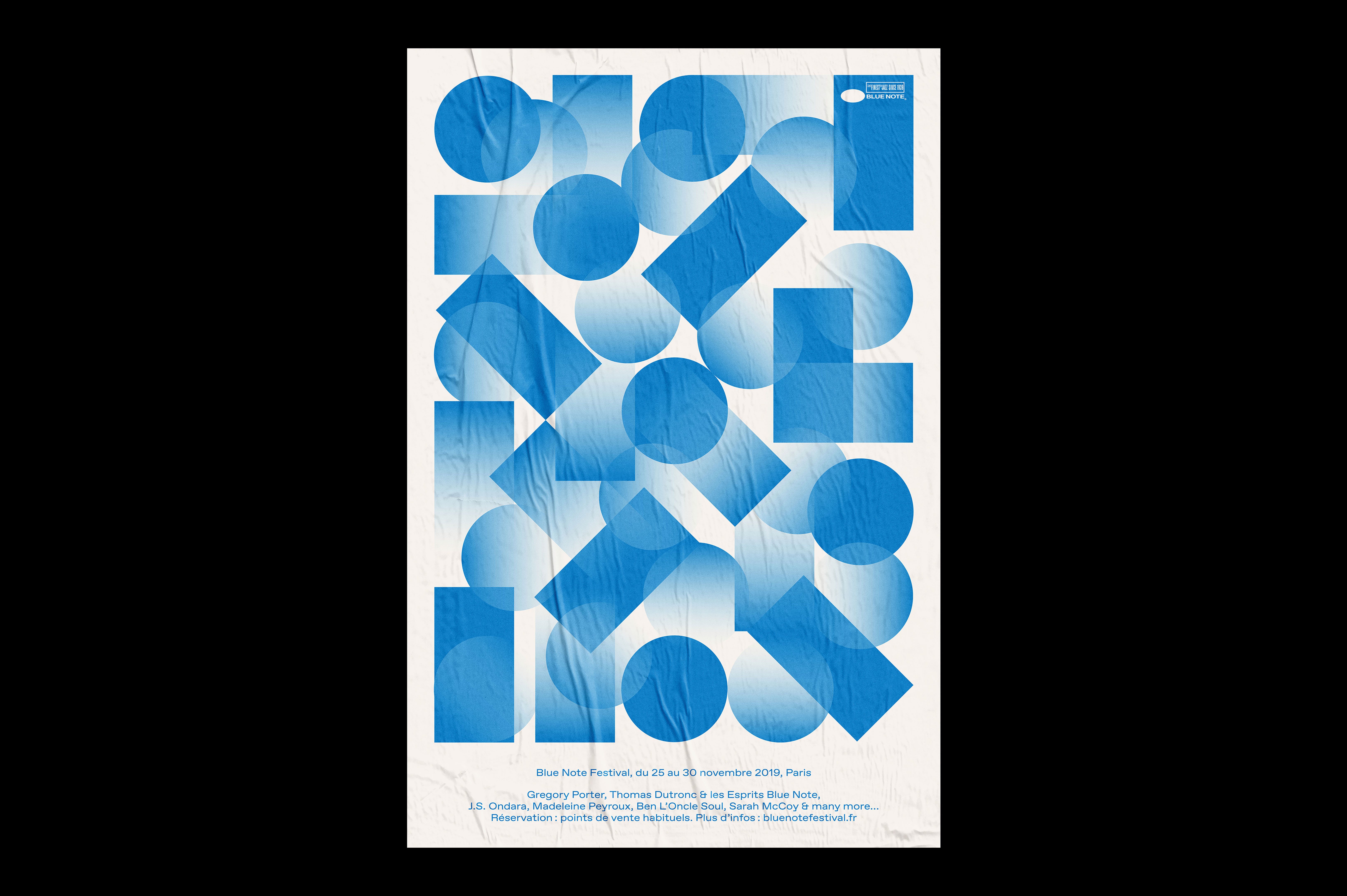 Identity of the 2019 edition of Blue Note Festival in Paris, France, featuring artists like Gregory Porter, Thomas Dutronc, Madeleine Peyroux, or Ben l’Oncle Soul.