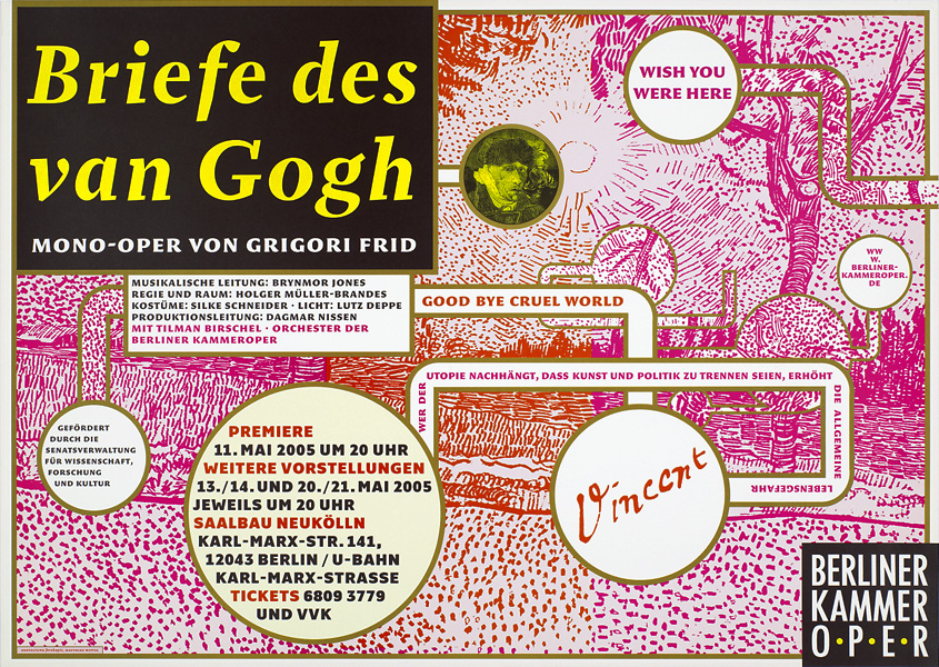 In 2005, the Berliner Kammeroper staged Briefe des van Gogh (The Letters of Van Gogh). This mono-opera by the Russian composer Grigory Frid (1915–2012) is based on the letters that Vincent van Gogh wrote to his brother Theo.