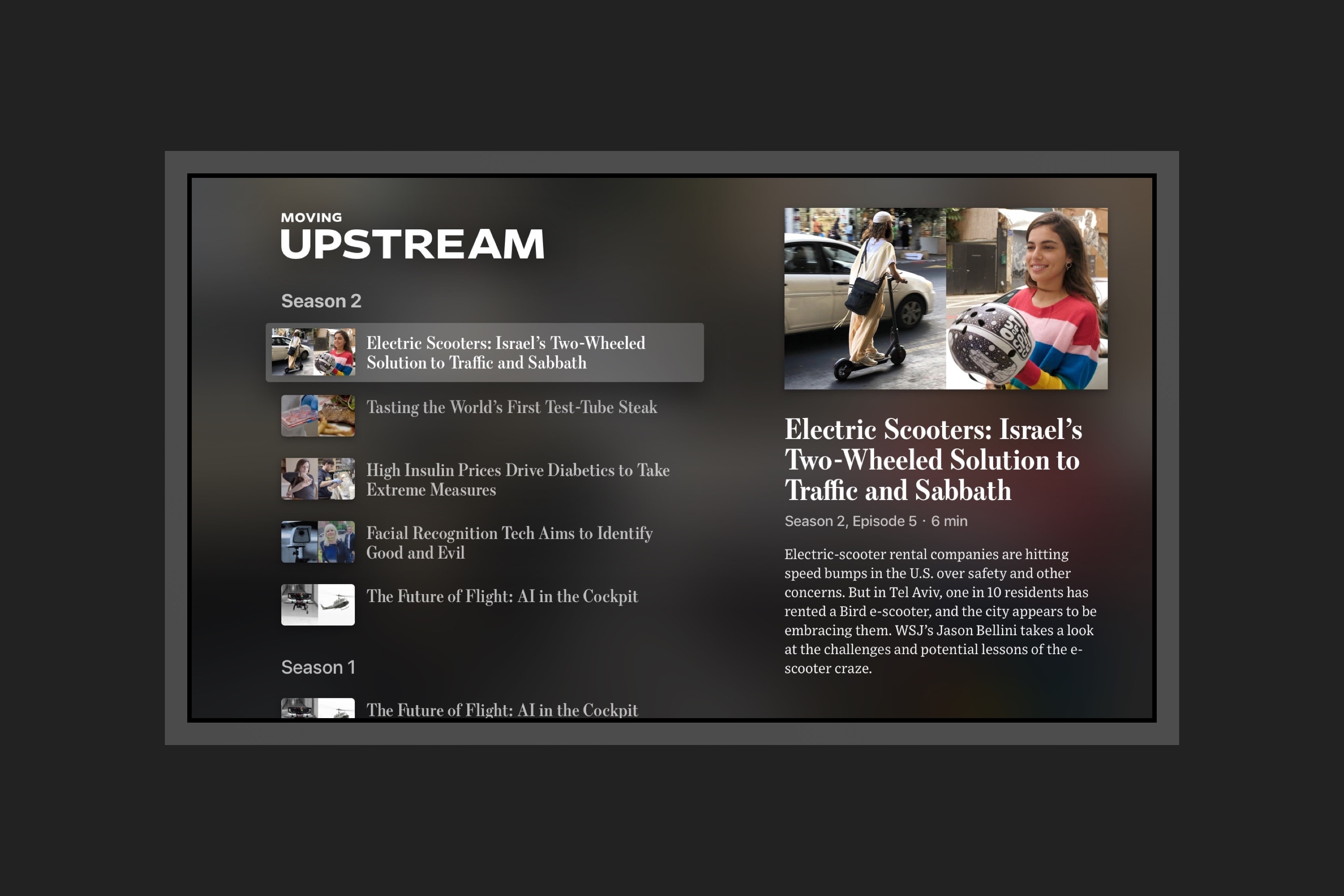 Escrow, Font Bureau’s iconic Scotch serif that has served as a cornerstone of the publication’s identity for decades, is front and center in the new app, linking the brand’s heritage to this newer platform with its hallmark foundation of excellent journalism at the forefront. As the WSJ’s Adam Fisher-Cox put it: “using Escrow for the video titles lent the interface an unmistakable WSJ ‘look’, allowing us to use Apple’s excellent San Francisco for all smaller labels and descriptions.” Retina by Frere-Jones Type appears in multiple widths, for headlines (“Moving Upstream”) and titles of TV shows (last image).