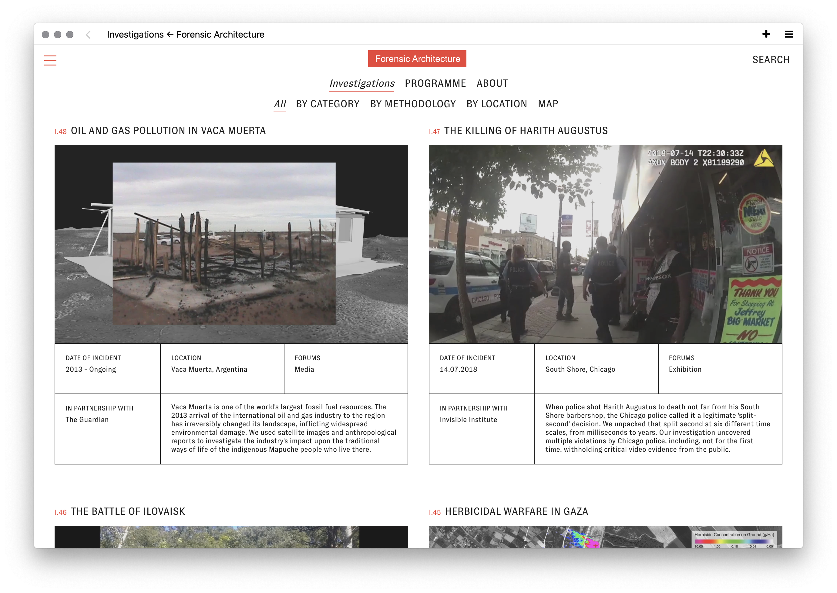 Forensic Architecture (FA) is a research agency, based at Goldsmiths, University of London. They undertake advanced spatial and media investigations into cases of human rights violations, with and on behalf of communities affected by political violence, human rights organisations, international prosecutors, environmental justice groups, and media organisations. — Forensic Architecture