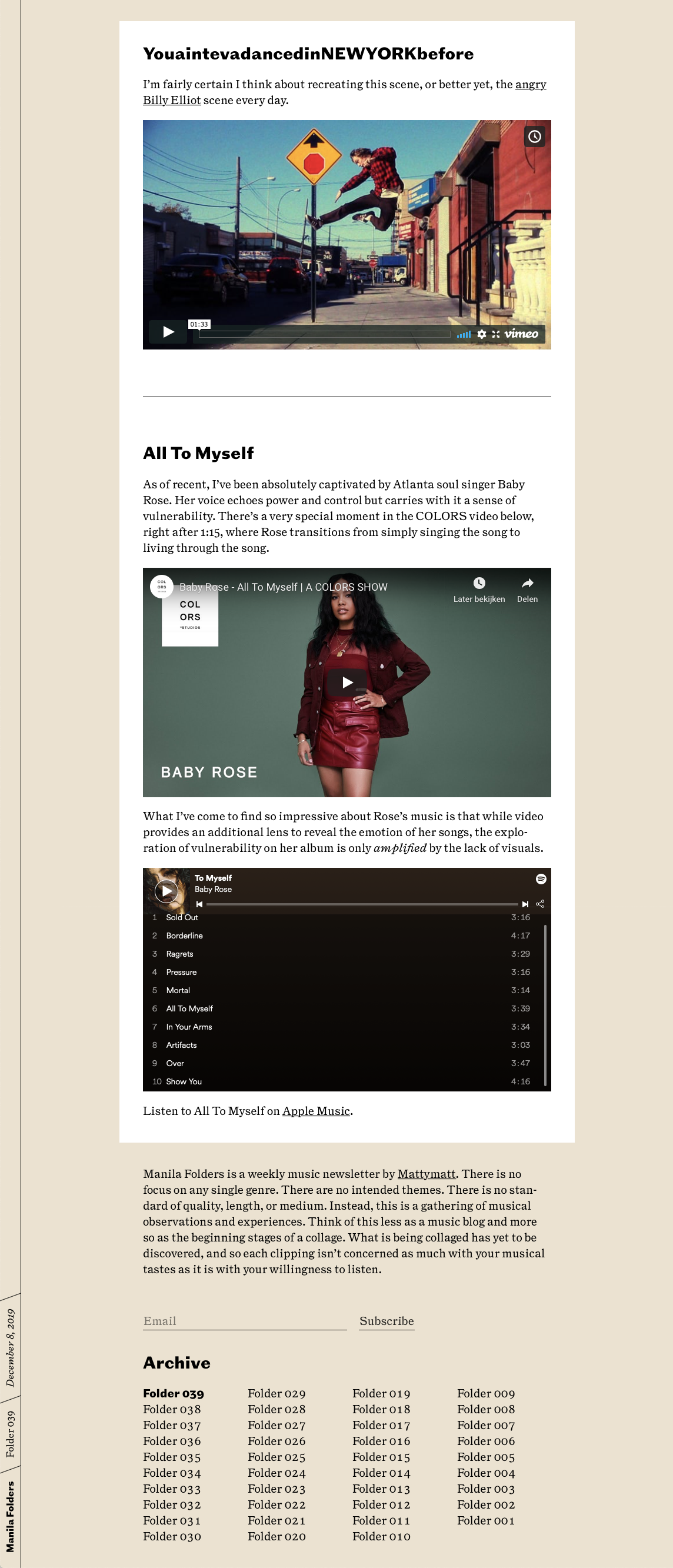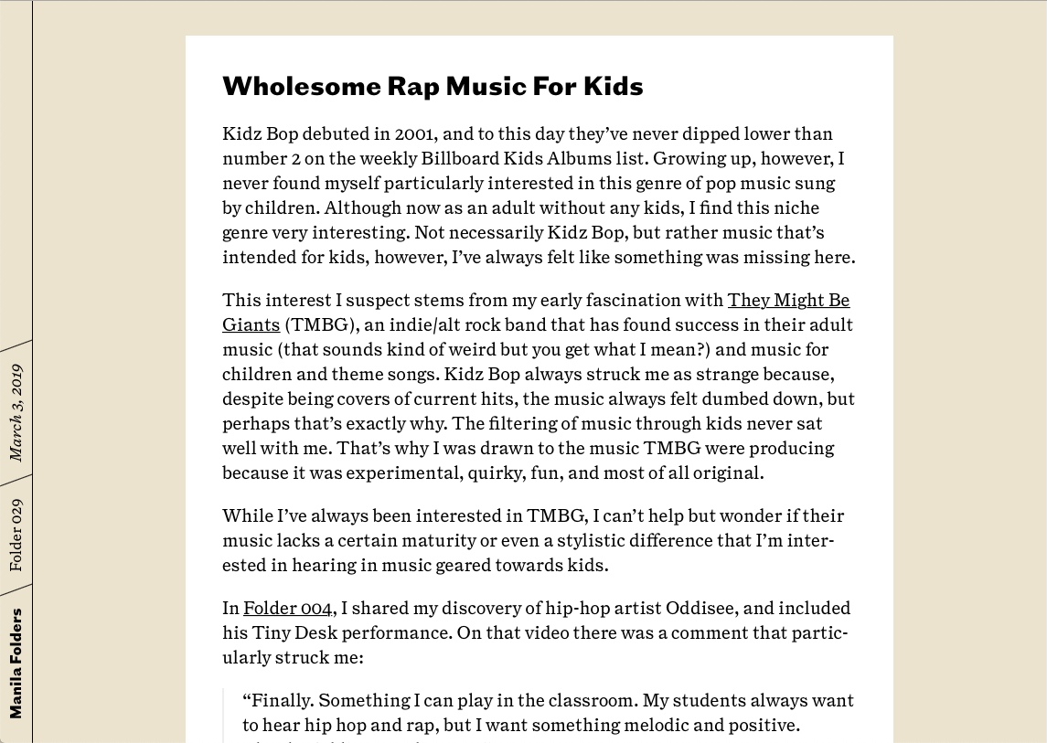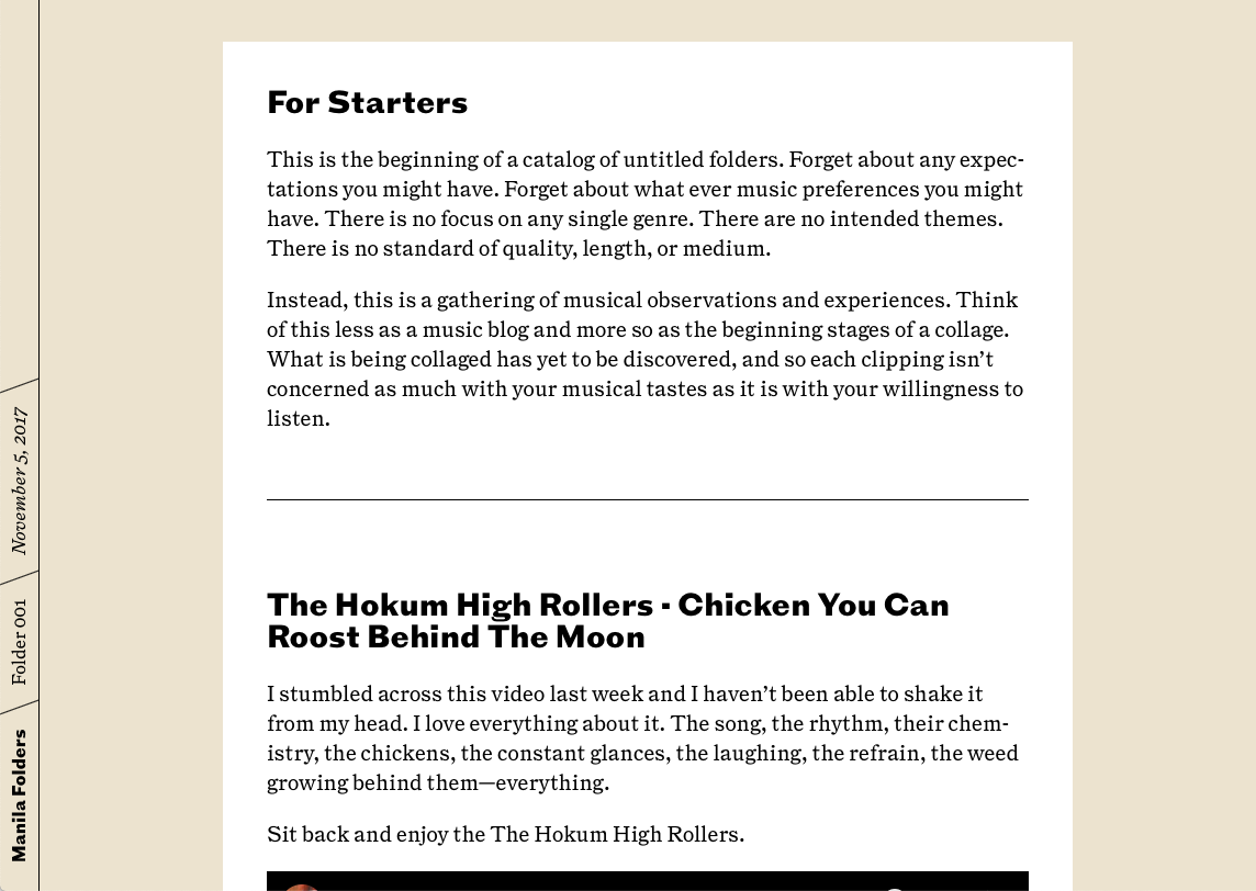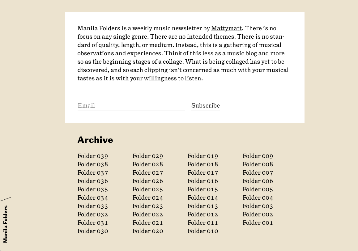 Manila Folders is “a weekly music newsletter” by writer, designer Matthew Smith, launched in 2017. Matthews describes the blog as “a catalog of untitled folders”, allowing him to write, collect and share any music from any genre (expect mostly soul, rap, indie music and Tiny Desk Concerts).