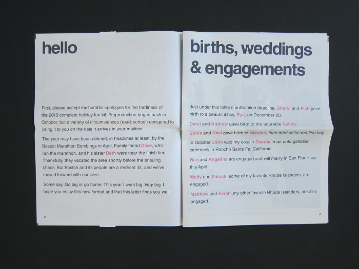 Saul Baizman, a Boston based web designer and teacher, at one point sent out a Holiday Fun Kits to his friends and family as an annual newsletter. This newsletter included mention of the Boston Marathon bombing.