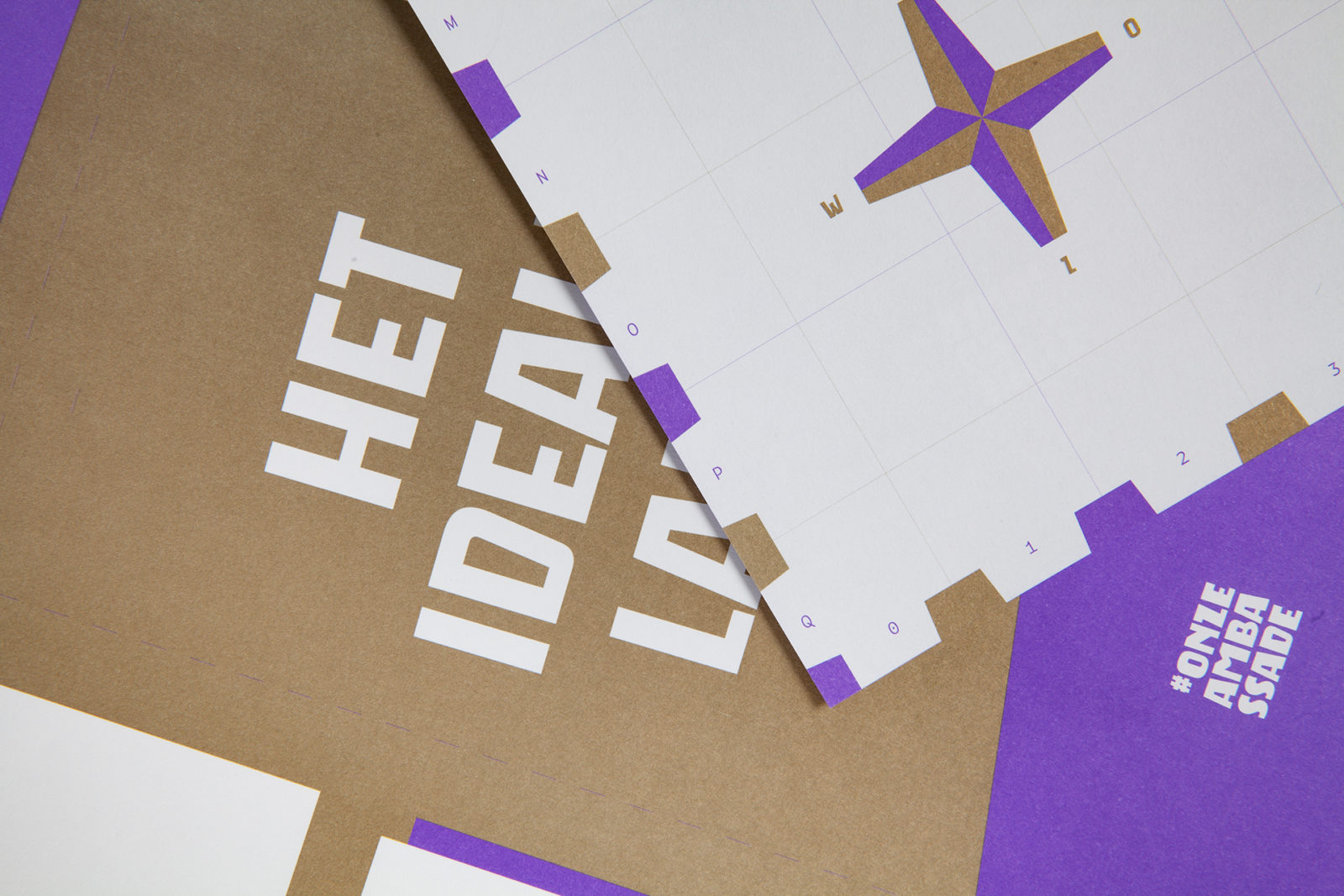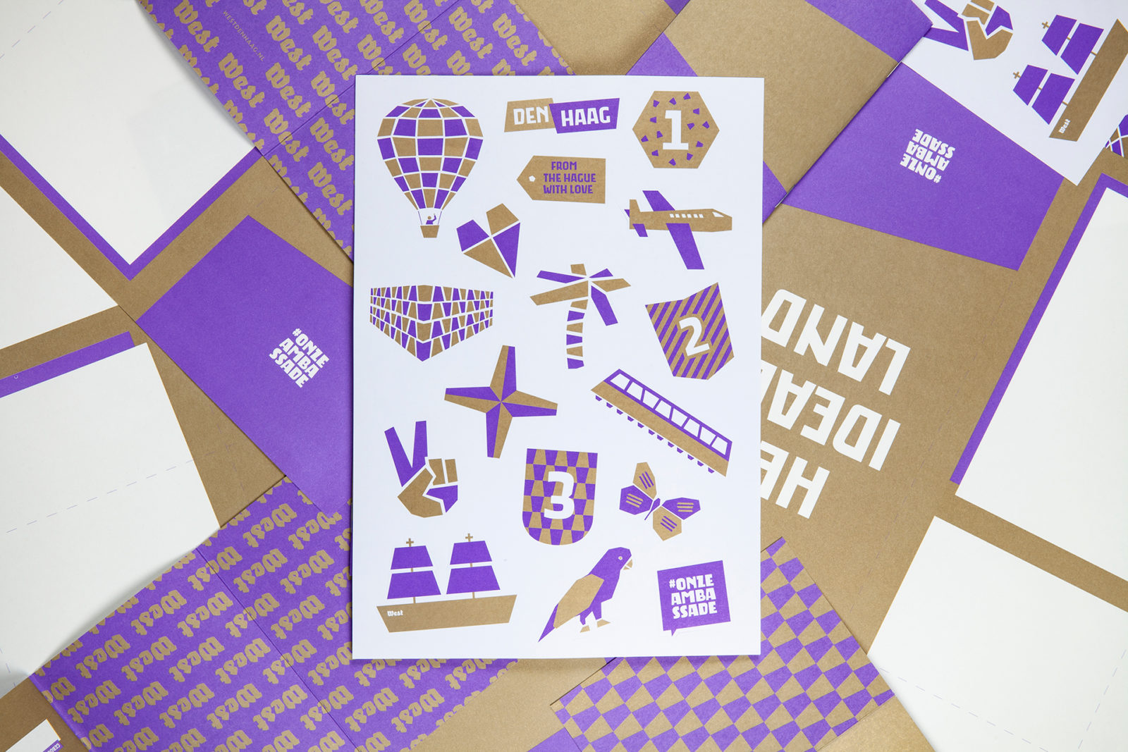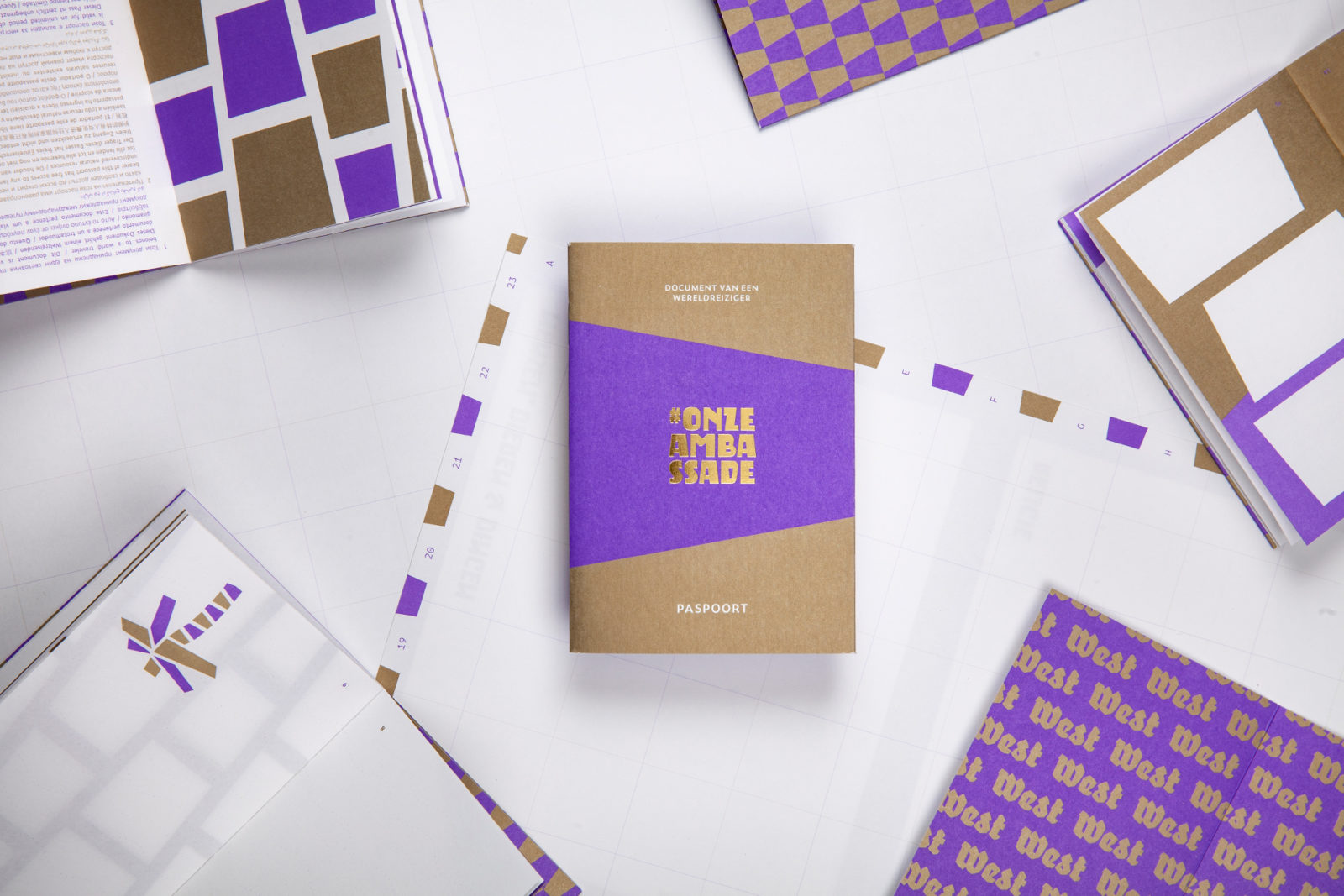I was asked to design the printed matter for Wereldreizigers. All the material arose from the question: ‘What’s your ideal country?’. We produced a map, passport and sticker sheets, all printed in two spot colors. The typeface is Gedankenexperiment, designed as a custom type-in-progress by typefoundry Underware. Its capitals clearly reflect on the trapezoid tiles that form the façade of the iconic embassy, designed by Marcel Breuer in 1956. The embassy logo, also designed by Underware, is based on Gedankenexperiment or vice versa.