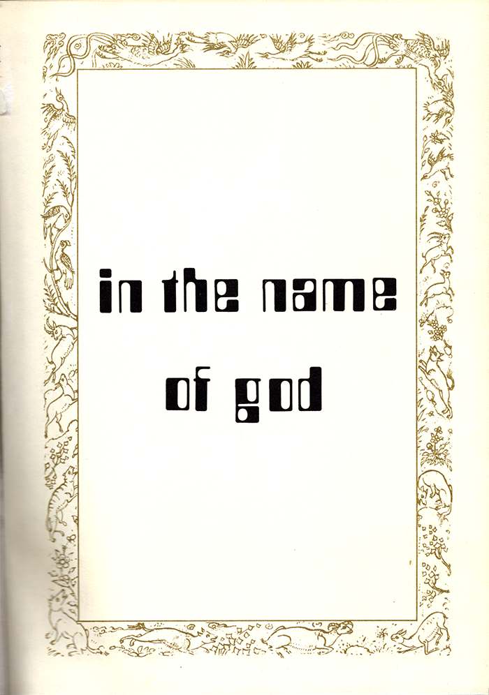 The cover miniature and the illuminations are by Ustad Khosh-nevis-zadeh, with inside miniatures by Ali Nasajpor, and calligraphy by Hosain Khosravi. The typesetting is by Sandra Mooney. In the imprint, her first name is abbreviated (just like Bell’s), presumably to circumvent regulations against women in the Iranian labor force.