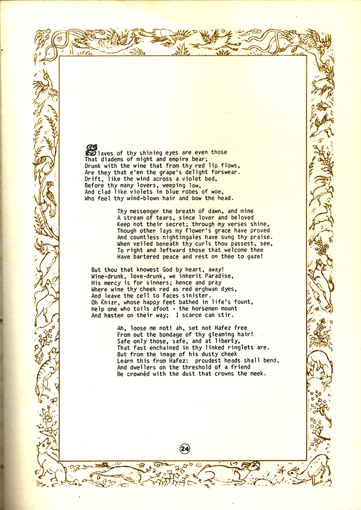 This collection of sonnets by Persian poet Hafez was first translated to English by Gertrude Bell in 1892. In 1985, Eghbal Publications from Tehrān issued a bilingual edition. The cover is set in Arnold Böcklin, with non-standard diacritics.
