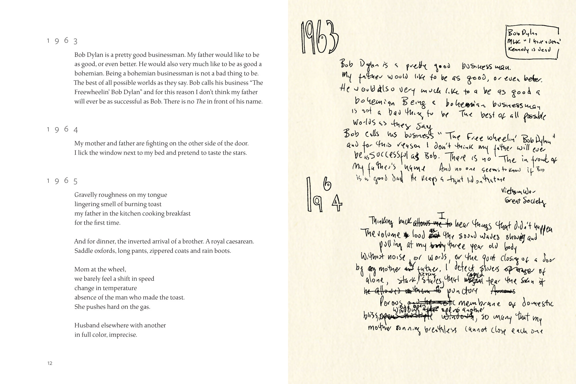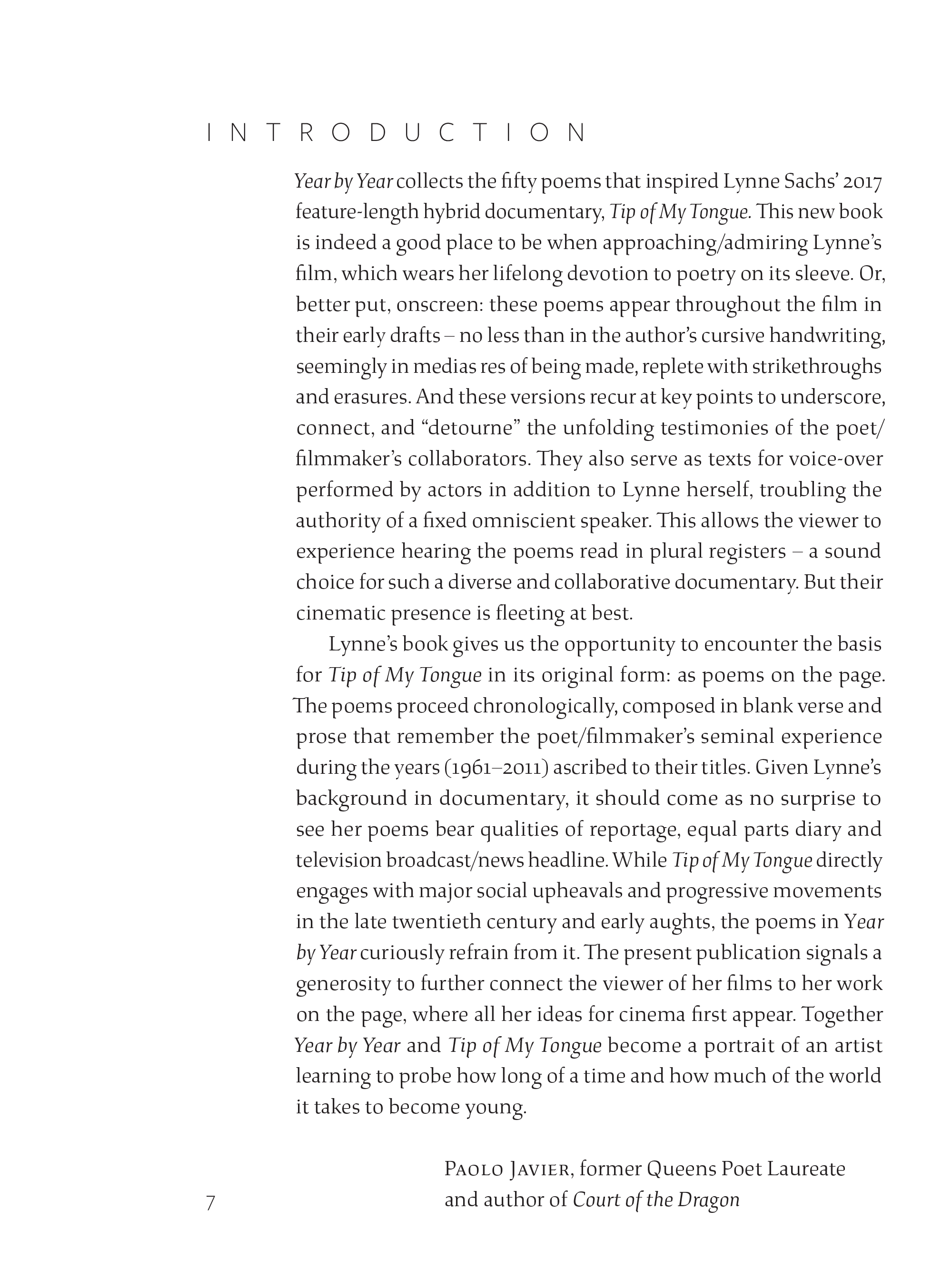 With one poem for each year from 1961 to 2011, the collection began as a half-century marker in Sachs’ life, reflecting on history and memory. The handwritten poems themselves became the basis for her 2017 documentary Tip of My Tongue.