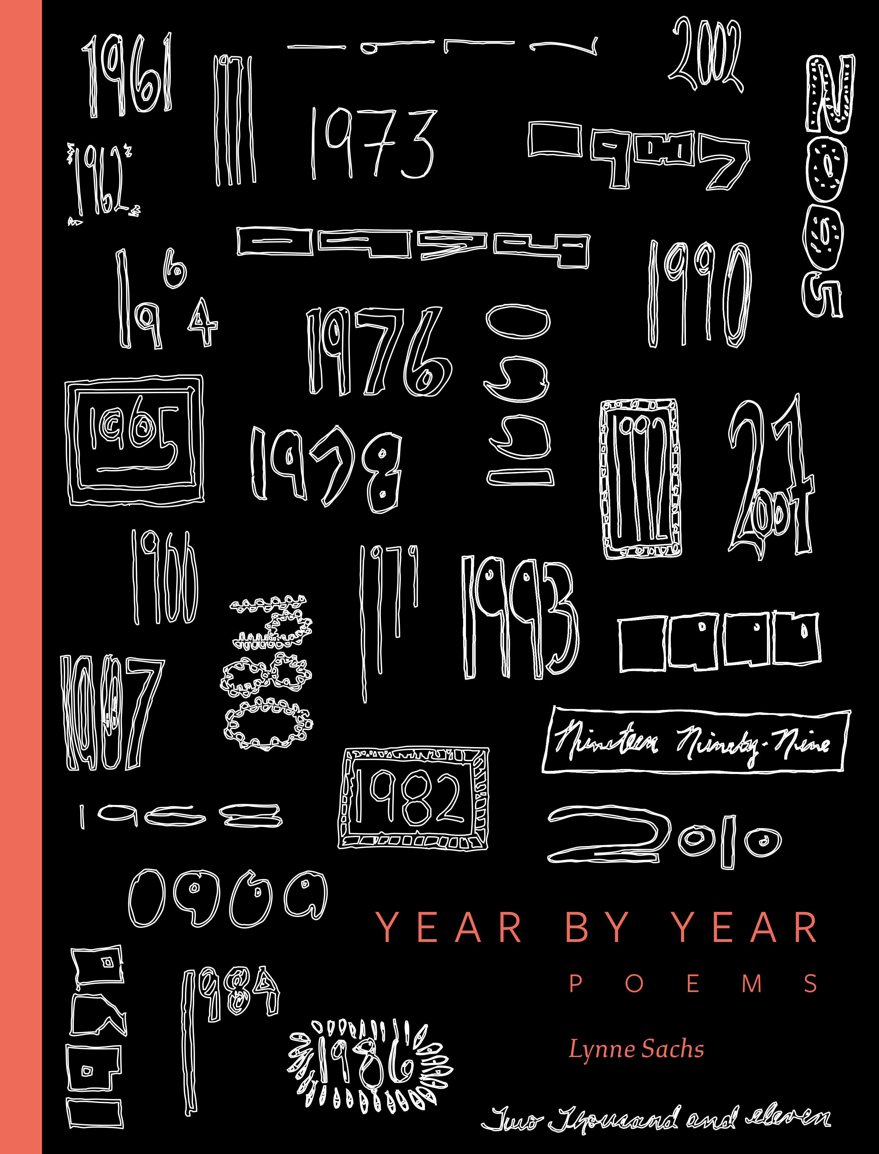 Year by Year, the first book of poetry by filmmaker Lynne Sachs, is the result of a deep collaboration with designer Abby Goldstein. Typeset in Study with headings in Freight Sans, the poems are presented adjacent to handwritten journal pages, emphasizing the relationship between content and form. The author’s eccentrically-lettered dates are isolated and collected on the book’s cover to create a cacophony of numbers that reflects the movement of time.