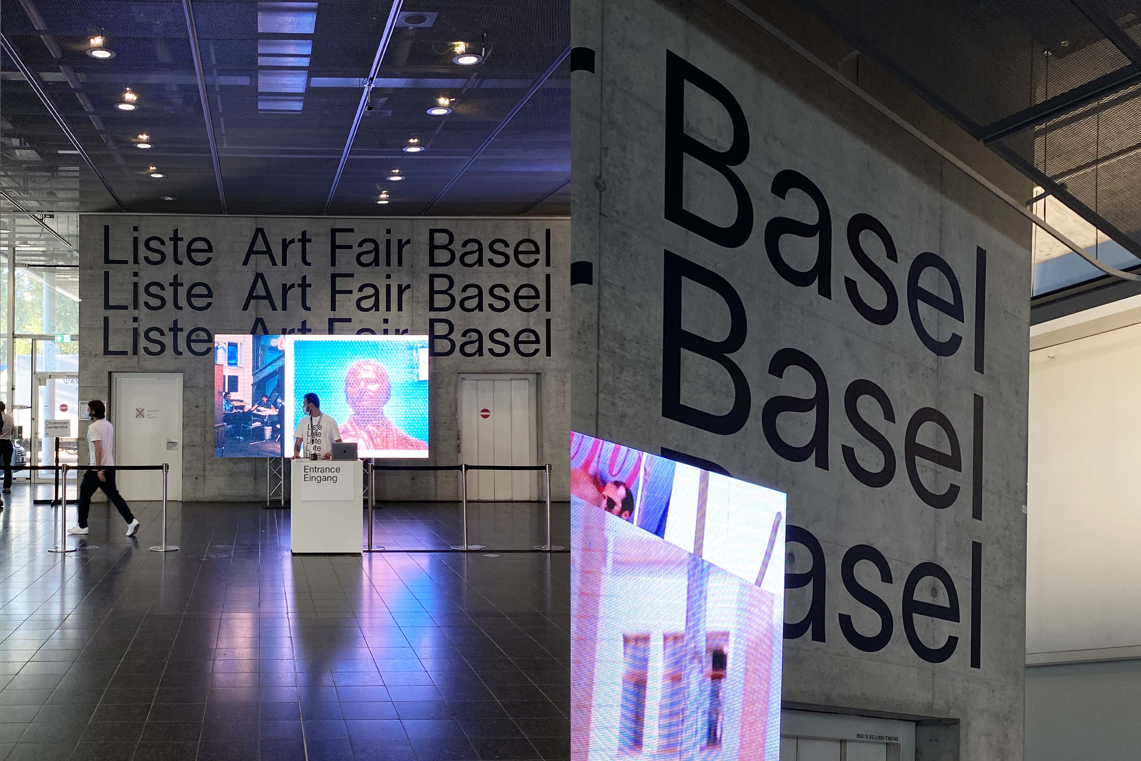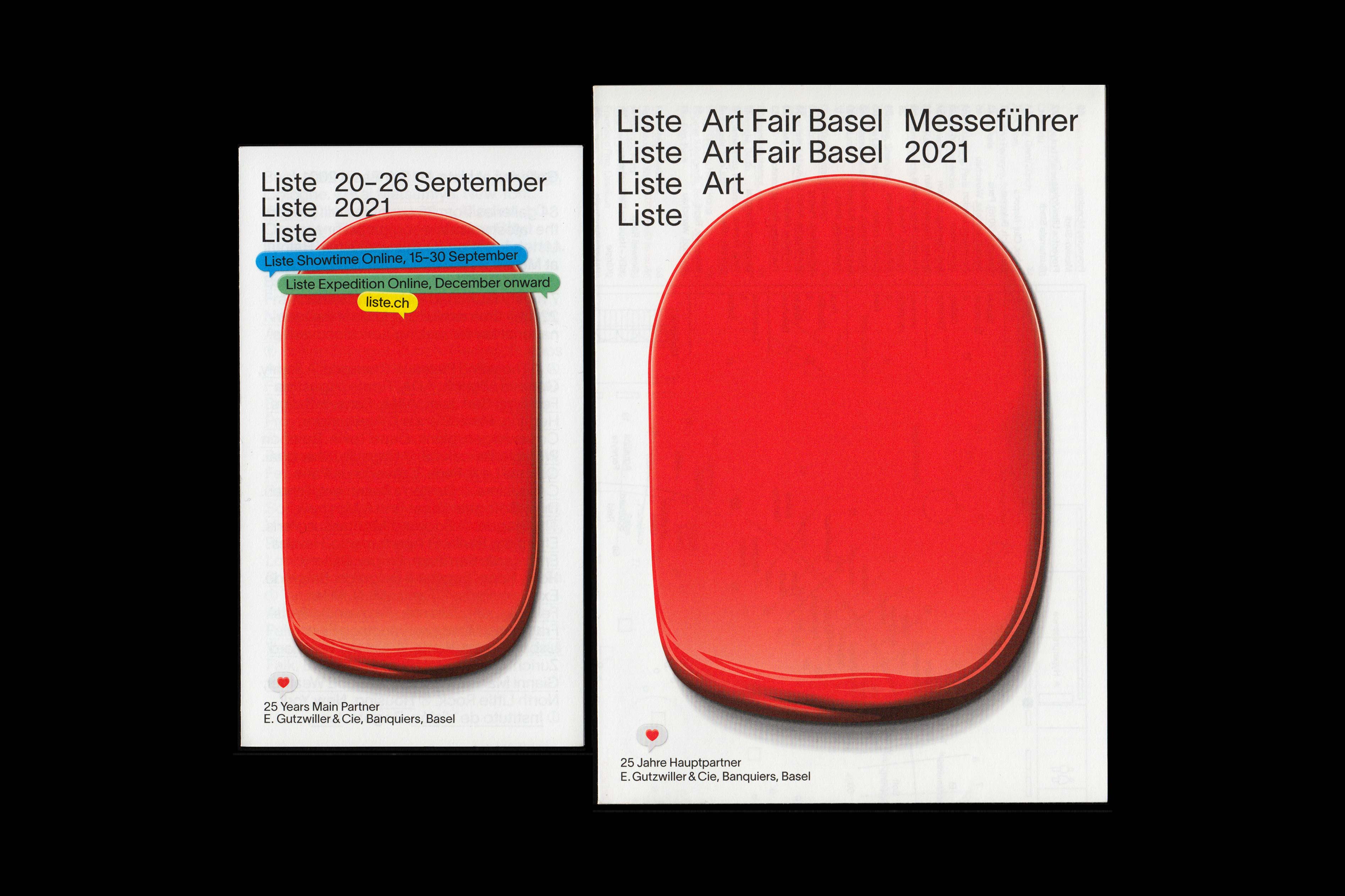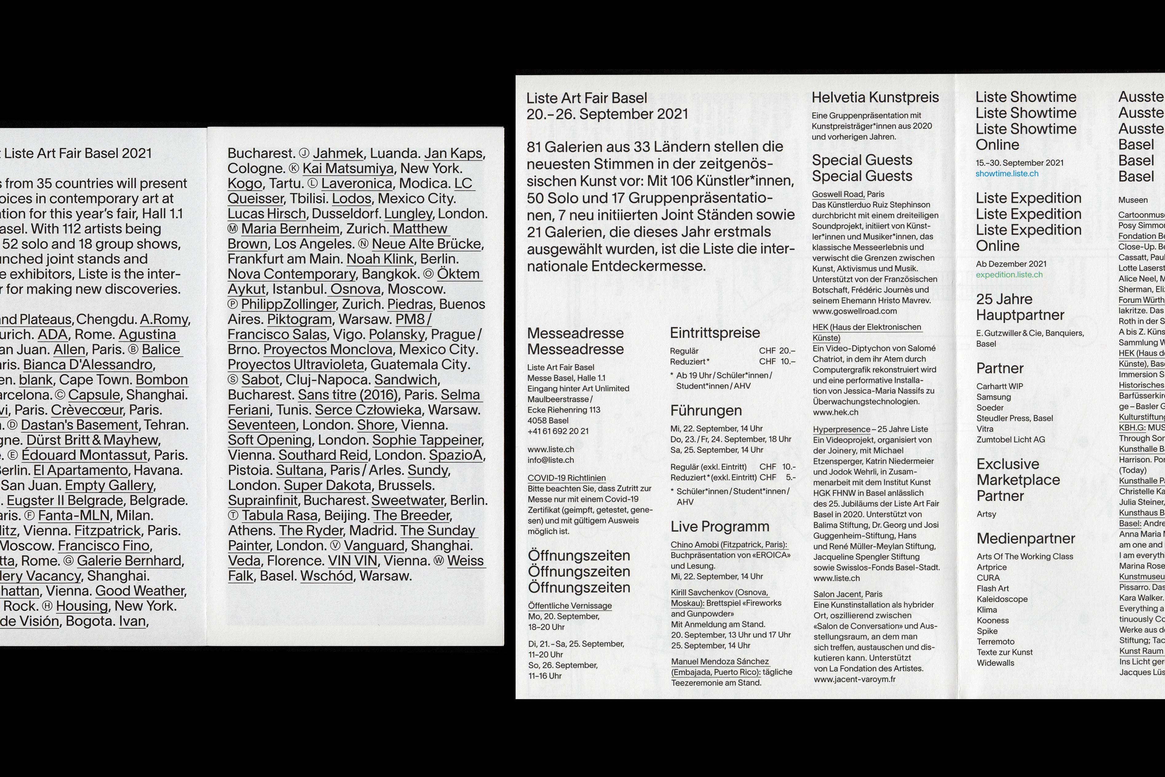 A strong new visual identity designed by Studio Feixen for the 2021 edition of Liste Art Fair, an art exhibition held in Basel at the same time and next to Art Basel 2021. Lausanne(designed by Nizar Kazan) is used in many scales on the posters, signs, and publications.