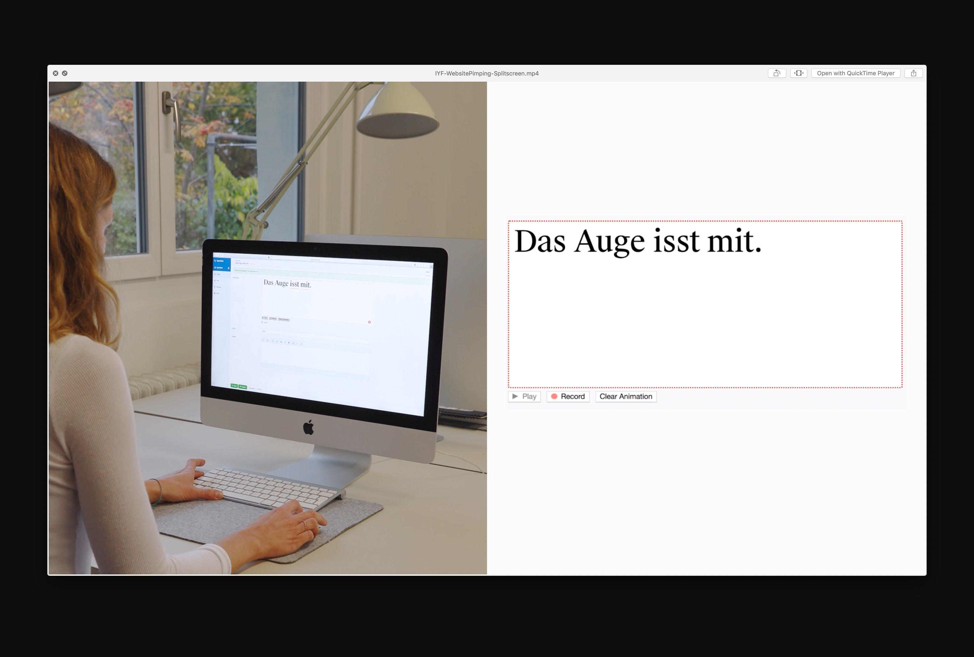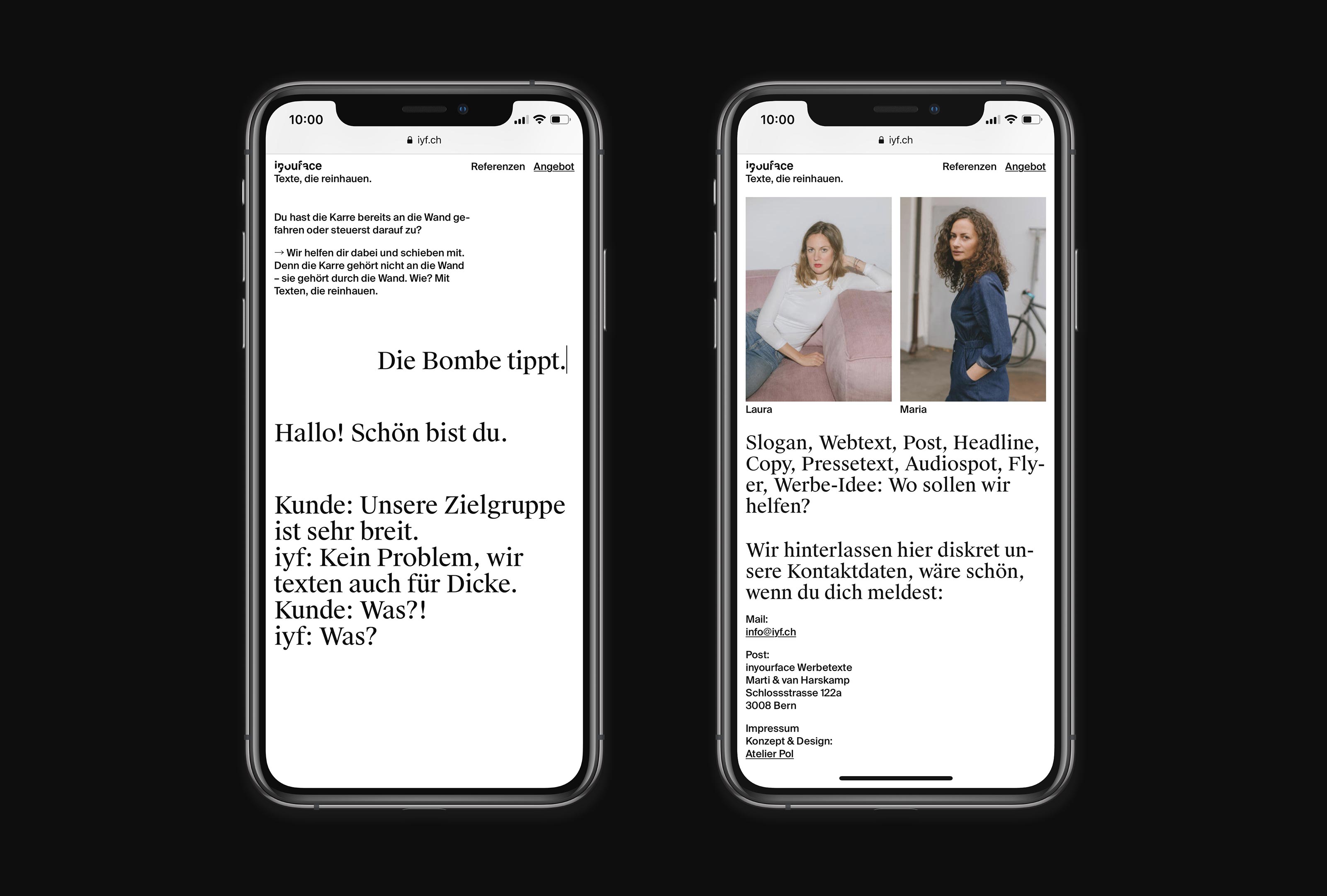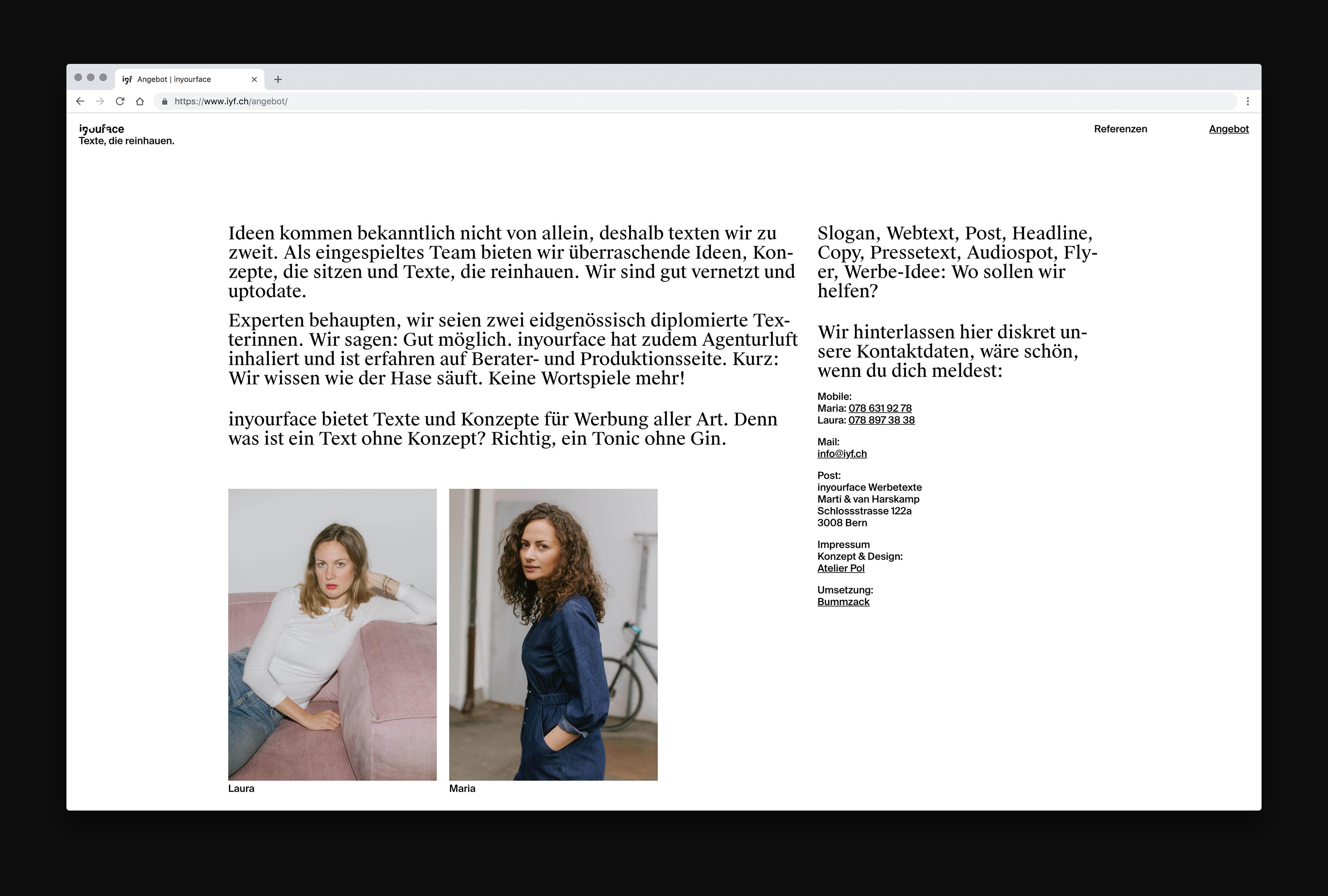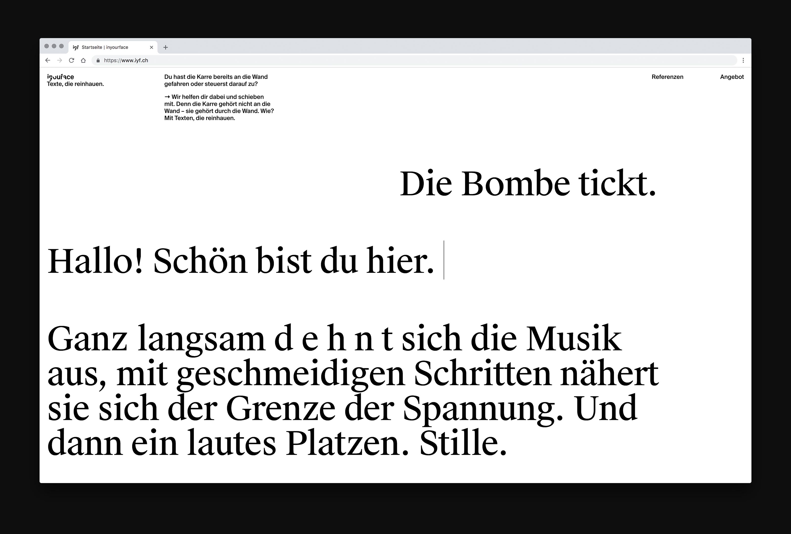 On the new website of inyourface you can watch the two copy writers Laura and Maria text live. Together with our technical partner Roman Schmid we designed a website where they can record text snippets in real time in the custom built backend. The animations are then being played back (and looped if wanted) as real – and search-engine-friendly – text on the main page.