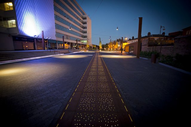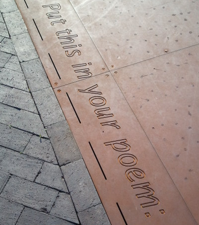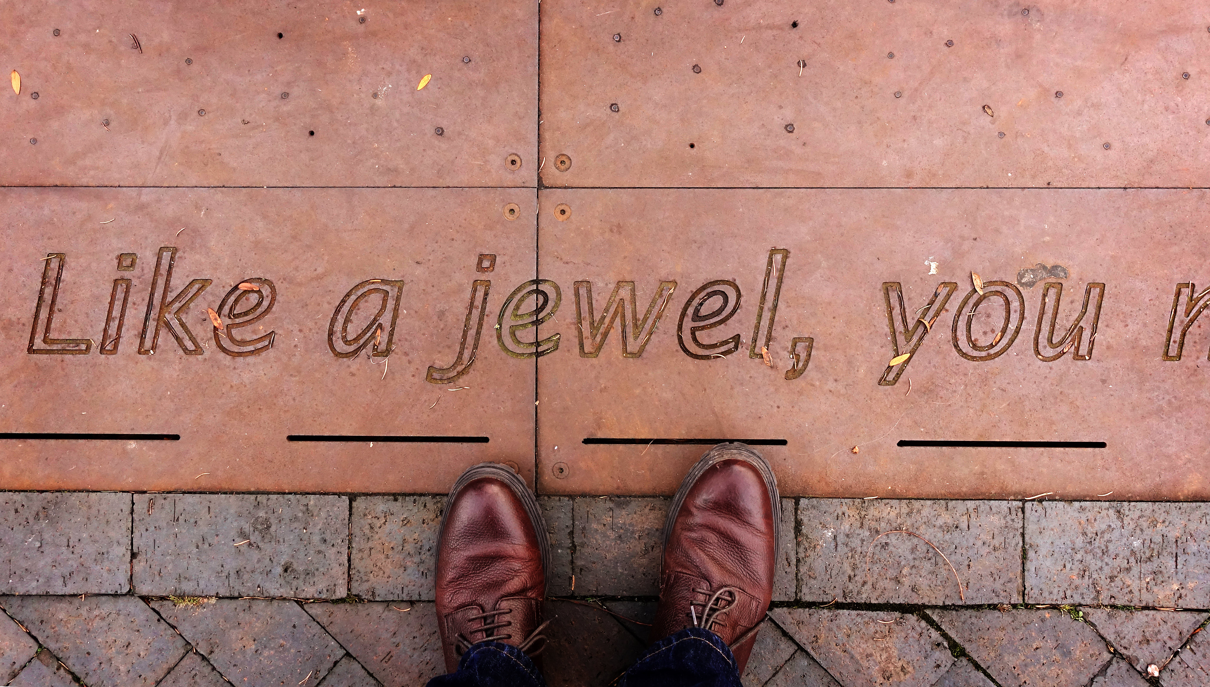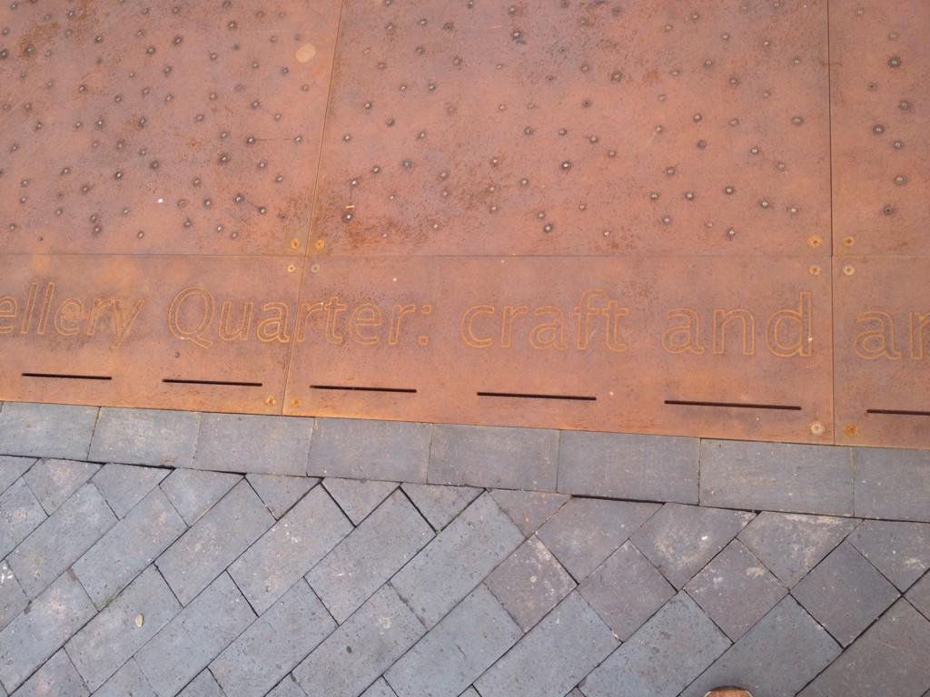 Ian McMillan’s poem “Talking to Somebody about the Jewellery Quarter” was inspired by a visit to the neighbourhood in central Birmingham. In 2015, it was laser-cut into the seam that runs down the middle of the Golden Square on Warstone Lane, Birmingham. [The Hockley Flyer] The typeface in use in Lucida Sans, in roman and italic styles. The text reads:
