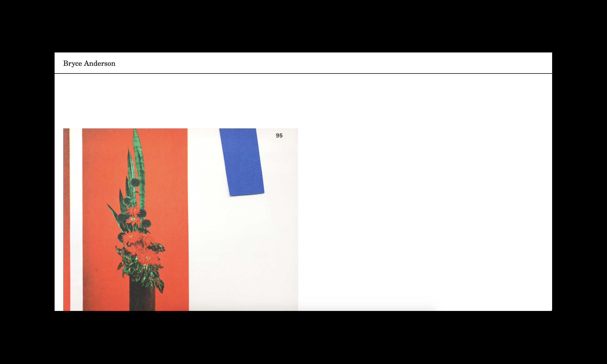 Anderson’s website, designed by New Association, utilises TeX Gyre Schola of Donald E. Knuth’s TeX project. TeX Gyre Schola is based on URW Century Schoolbook L, which is a digitization of Century Schoolbook, originally designed by Morris Fuller Benton in 1919. Schola serves as a replacement for the standard New Century Schoolbook font. Despite being almost optically identical to New Century Schoolbook, the distinction between Tex Gyre School and New Century Schoolbook is telling of Anderson’s art practice—one where representation, reproduction, appropriation and authorship are key themes. Anderson’s oeuvre often draws upon found imagery from textbooks and printed ephemera, reproducing and altering these images through digital and mechanical print processes, oil painting and collage.