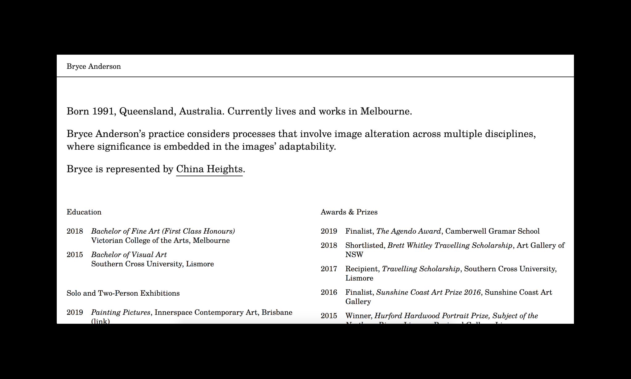 Bryce Anderson is an Australian artist whose practice considers processes that involve image alteration across multiple disciplines where significance is embedded in the images’ adaptability.