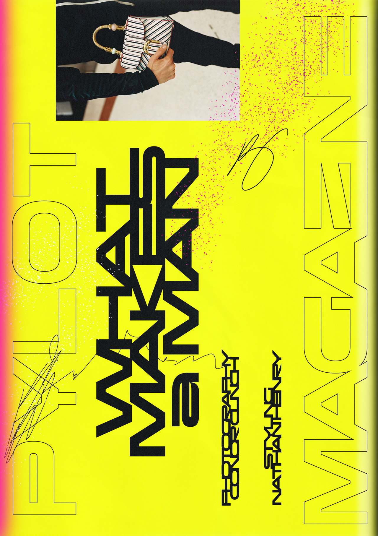 Poster for a fashion feature in Pylot magazine, designed by Allan Yu AKA MarsMaiers using PVC Banner. The ultrawide style that is part of Production Type’s PVC family is featured in rotated lines of tightly spaced, electronically condensed, and partly outlined caps. The technoid glyphs by Hélène Marian are contrasted with handwritten scribbles and digital spray paint.