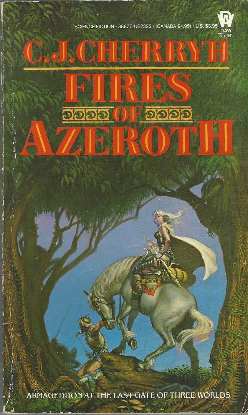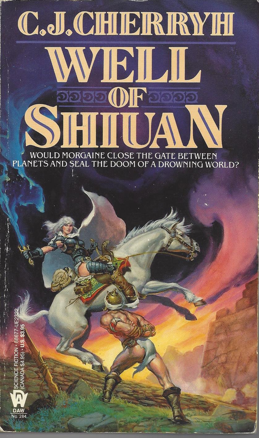 The first three books were published by DAW Books in 1976 (Gate of Ivrel), 1978 (Well of Shiuan) and 1979 (Fires of Azeroth). These cover designs probably date from around 1988, when the fourth novel, Exile’s Gate, came out. They feature the cover art by Michael Whelan that already was used for the first editions.