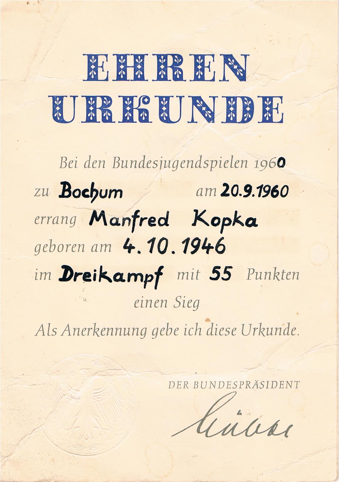 The Bundesjugendspiele (“Federal Youth Games”) are an annual sports event that takes place at German schools and German international schools. They are obligatory for all students. […] The performances achieved are rated with points. If the participant achieves a specific minimum score, they are given a simple certificate. Above a certain higher score they receive an ‘honorary certificate’, which bear the (printed) signature of the Federal President.