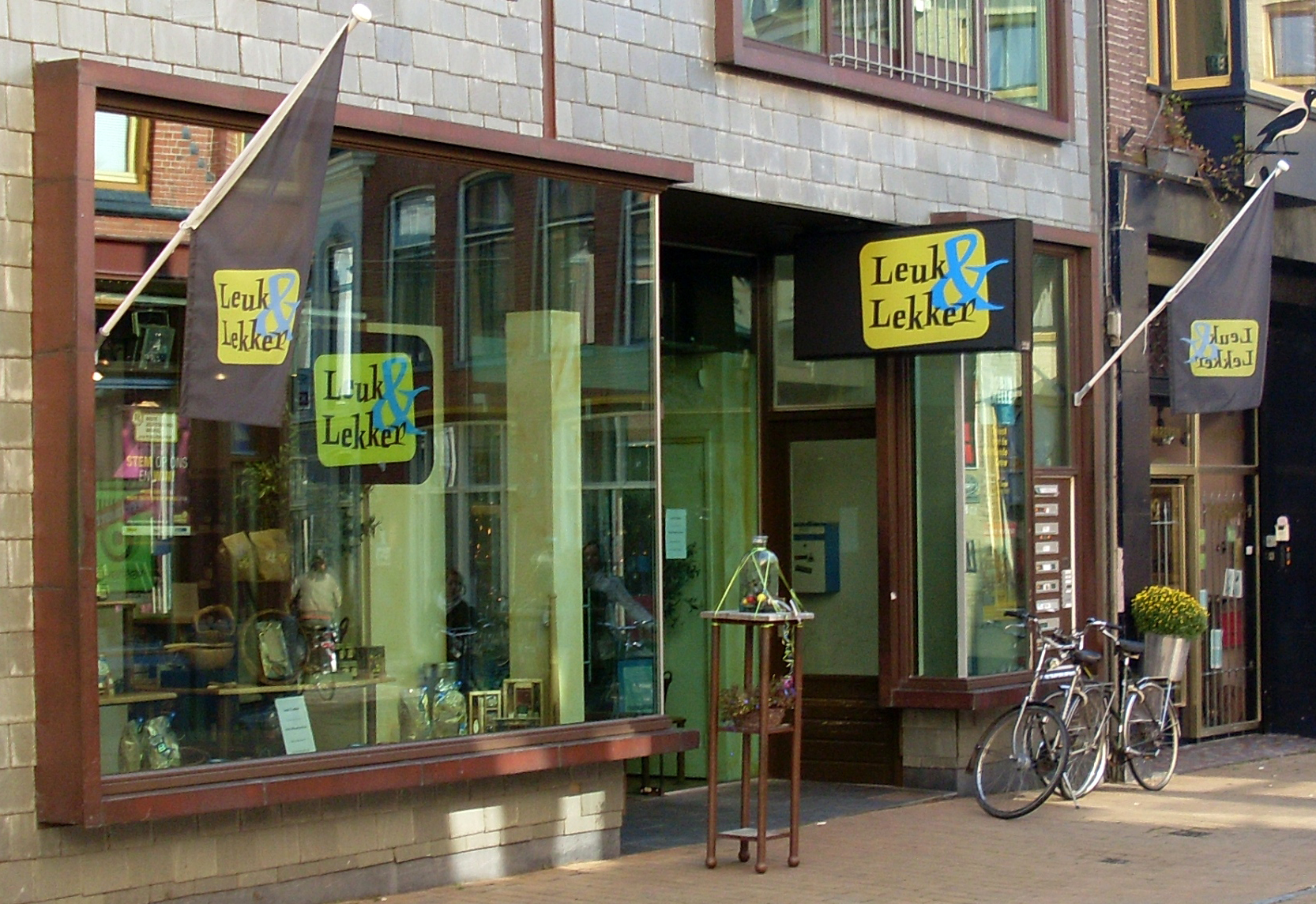 The spiky Punten is one of several fun alphabets drawn by Luc(as) de Groot. Conceived in 1993, it was made into a full typeface and released by LucasFonts in 2002. The shop sign and flags of the Leuk & Lekker (“Nice & Tasty”) deli indeed combine glyphs from all three styles. While most letters are taken from the moderate Punten Straight, the ampersand is from Punten Extremo, and the r from the hilarious Punten Rondom (Dutch for “all around”). In the latter, “each character is entangled by its own swashes – almost a parody of the seventeenth-century mannerist calligraphy that [de Groot’s] teacher Gerrit Noordzij is so fond of”, says Jan Middendorp in Dutch Type.