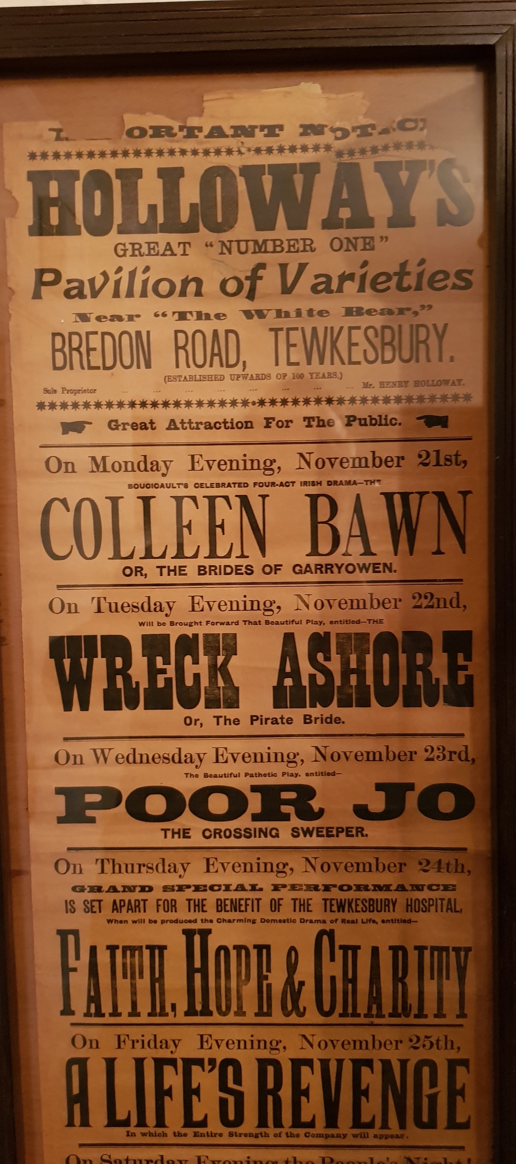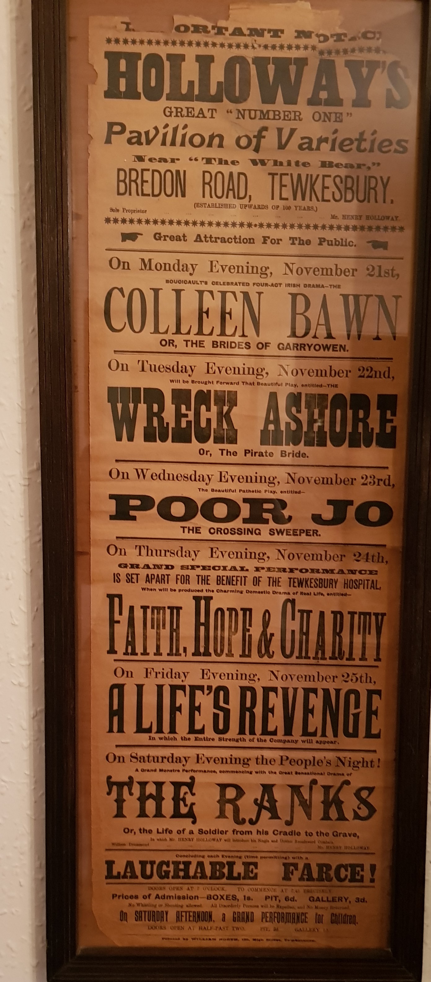 This is an advertising poster for Holloway, a British travelling theatre company, when it set up in the small town of Tewkesbury, Gloucestershire. By rule of thumb, it measures around 36 inches (if not slightly more) by 12 inches.