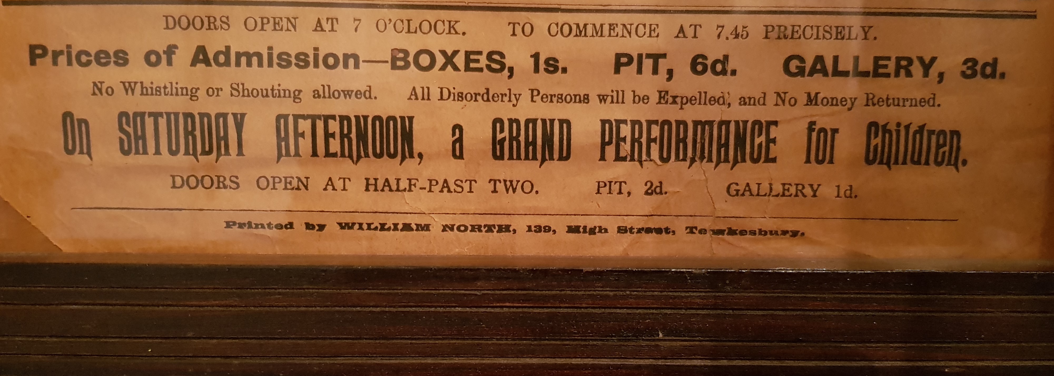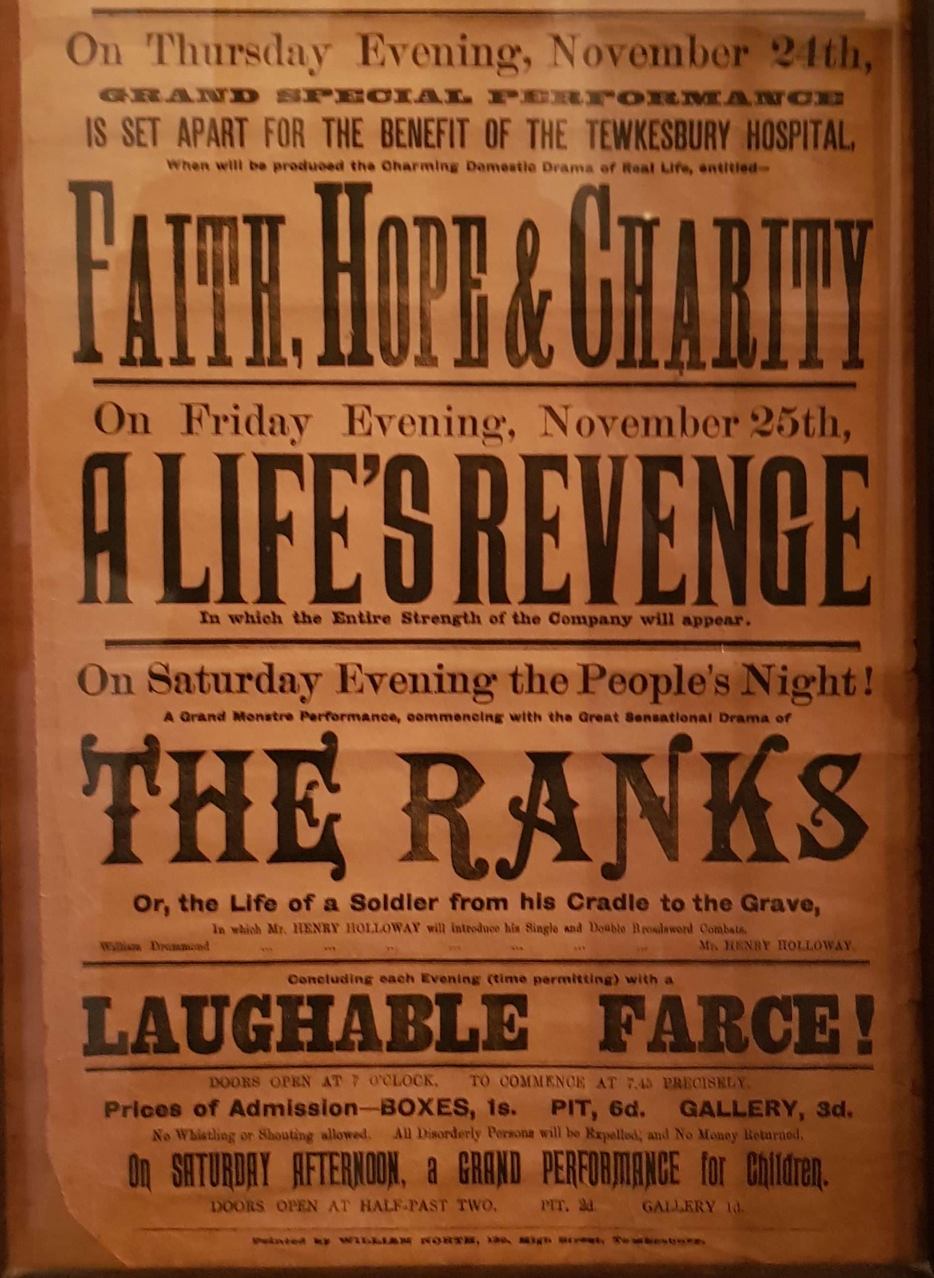 According to the owner of the poster it was probably printed in the 1890s. Years in which November 21st fell on a Monday include 1881, 1887, 1898, and 1910. 1887 or 1898 seem to be the most likely dates. The Tewkesbury Historical Society has some info on the printer, William North. In 1871 he bought the business that had been set up by James Bennett in 1810 and continued by Isaac Jenner. North died in 1907, and one R.A. Newman took over the business in 1921.