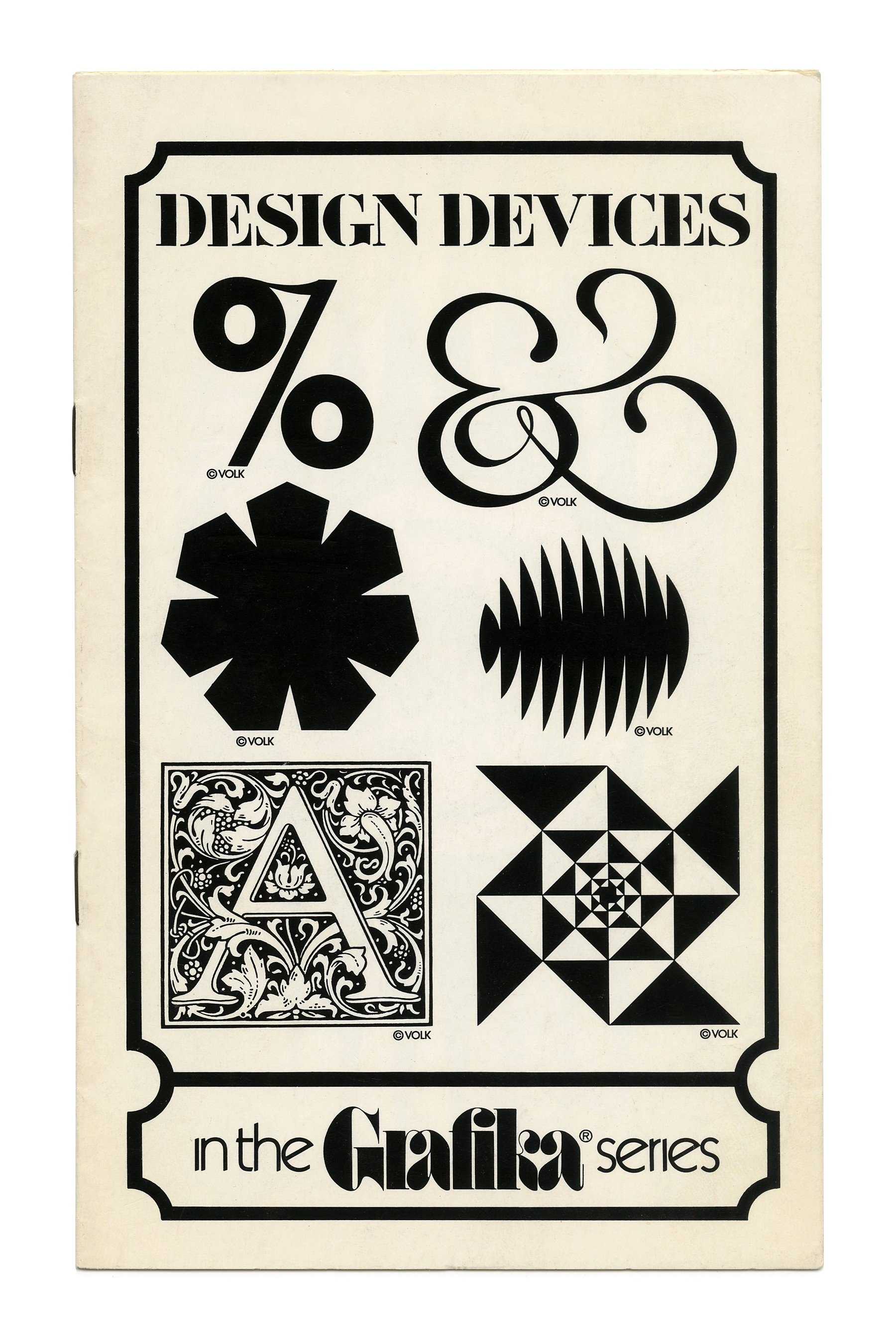 “Design Devices” (No. G75) ft. Charrette. The decorated A is taken from Cloister Initials. The logo of the Grafika subseries is in ITC Fat Face with ligatures for ra and fi, accompanied by Kabel Light with omitted tittles.