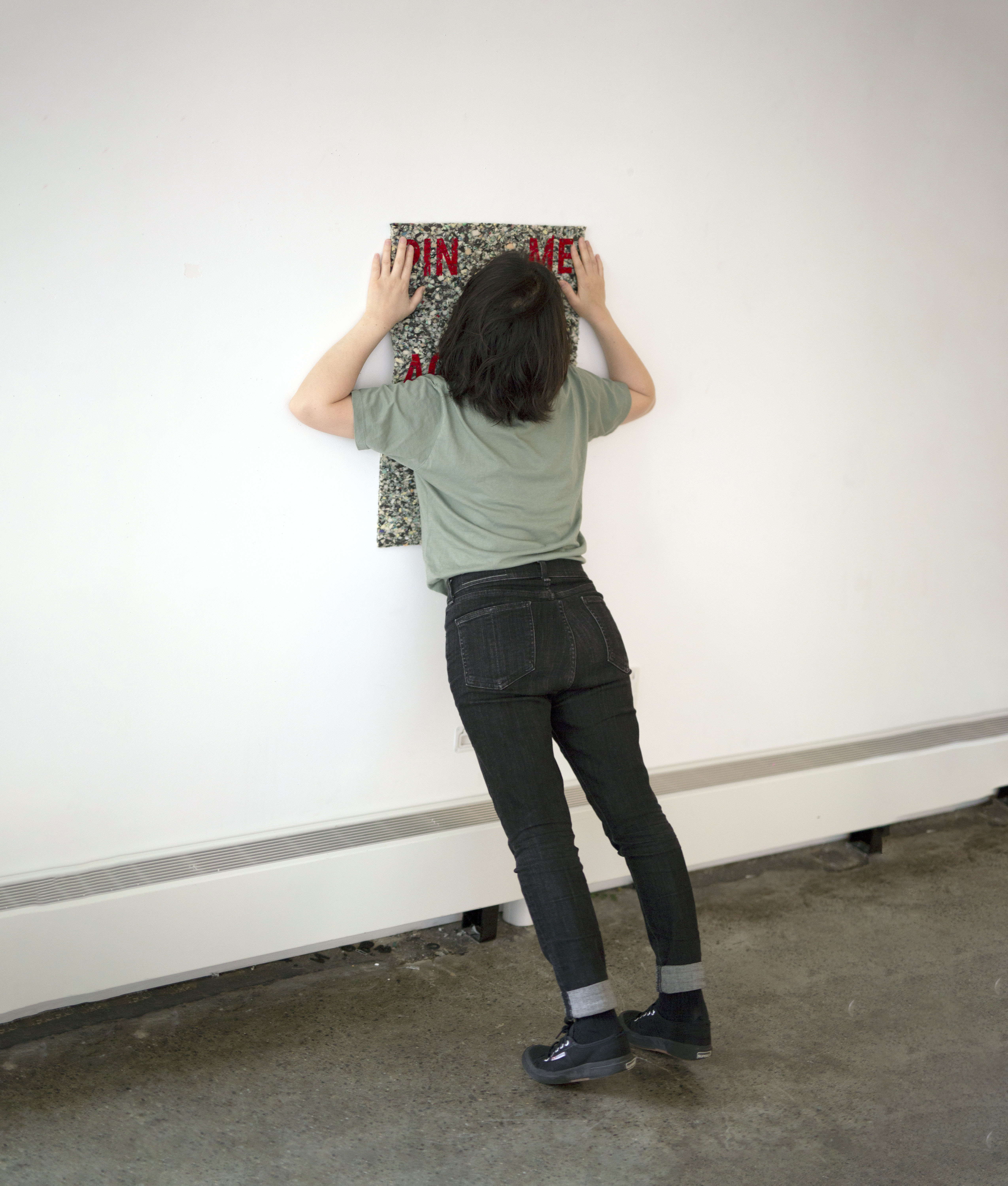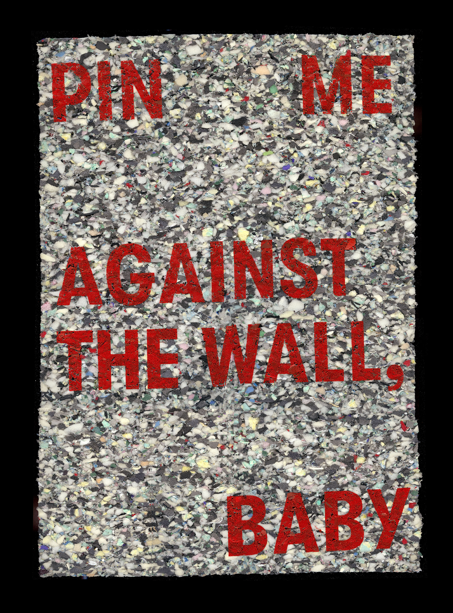 This unconventional poster using GT Walsheim Condensed is made from carpet padding hidden beneath wall-to-wall carpeting. The poster is interactive and takes cues form instructional art. As it sits in a pile on the floor, the top side of the poster reads, “PICK ME UP OFF OF THE FLOOR” in blue letters and on the back it reads, “PIN ME UP AGAINST THE WALL, BABY” in red. Carpet padding material is submissive in nature because it is hidden from view and walked on. The participant elevates the poster by pinning it to the wall. Pin Me is also making a sexy joke, drawing parallels between pinning a poster to the wall and pinning a person.