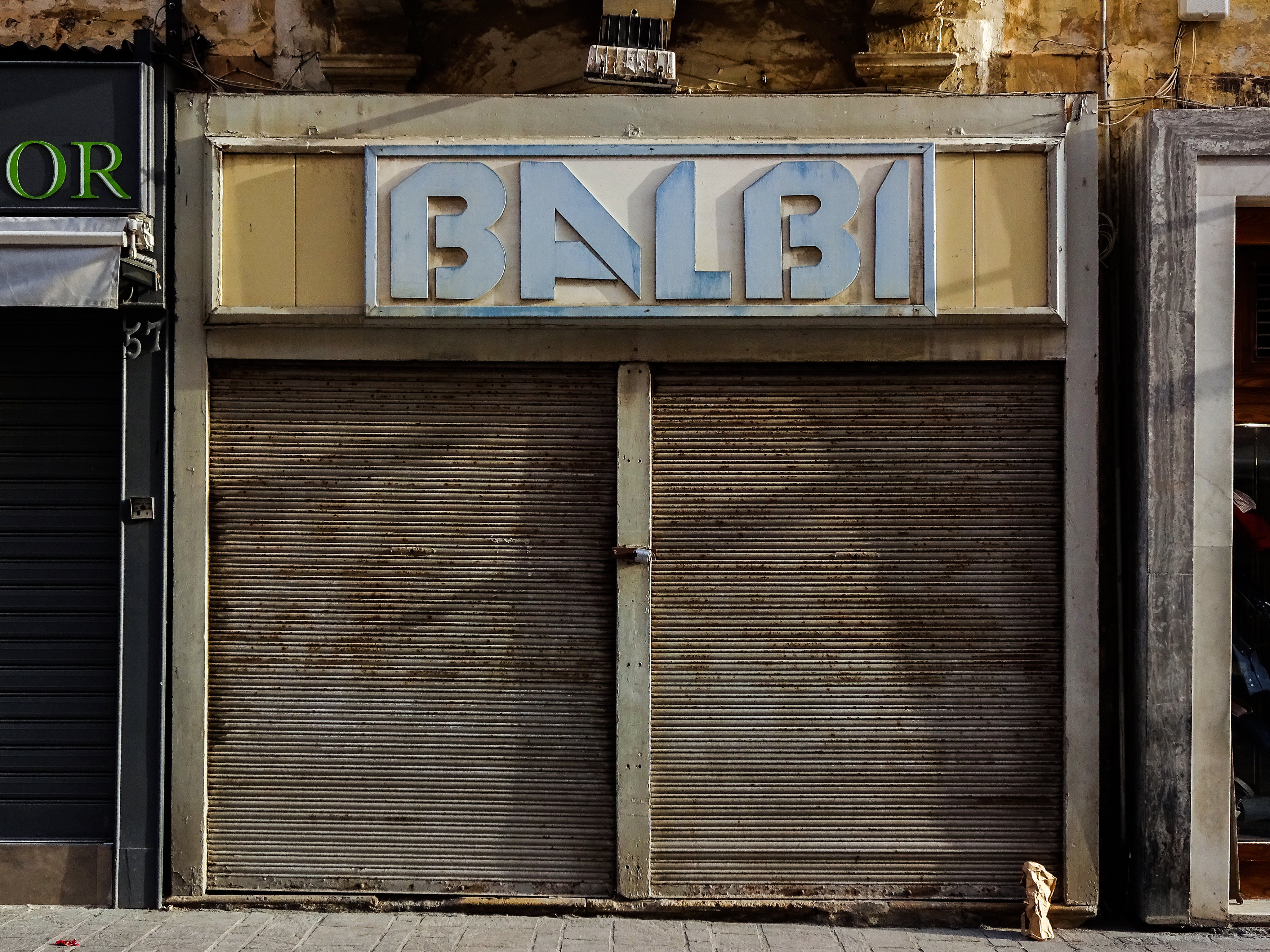 The shop sign uses New Zelek with a flopped A. This typeface was conceived by Polish designer Bronisław Zelek and first issued by Mecanorma, the French manufacturer of dry-transfer lettering sheets in circa 1974.