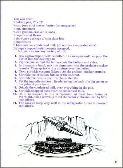 Even more absurd is the activity book pages, featuring type with psychedelic appearing illustrations and blue text. One section features a Dune themed recipe.