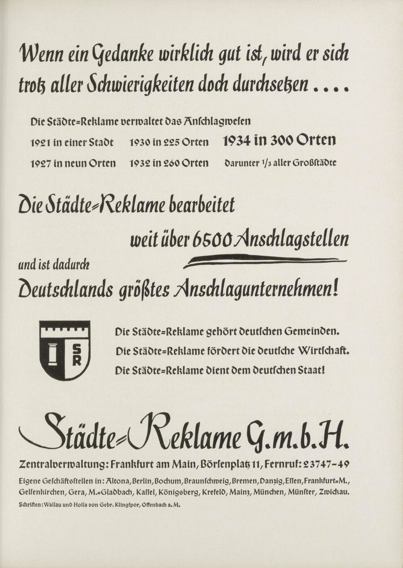 This ad for Deutsche Städte-Reklame GmbH was included in the September 1934 issue of Gebrauchsgraphik, a German journal for the graphic arts and printing trade.