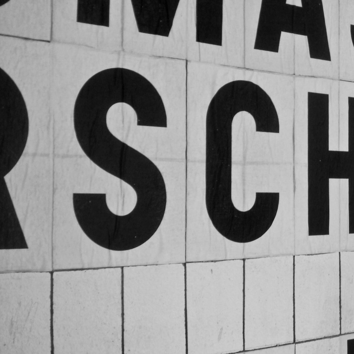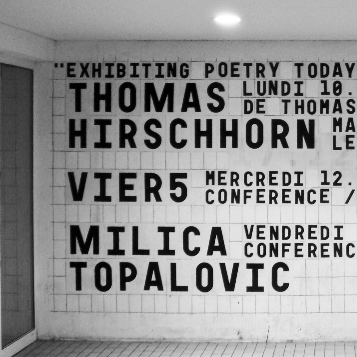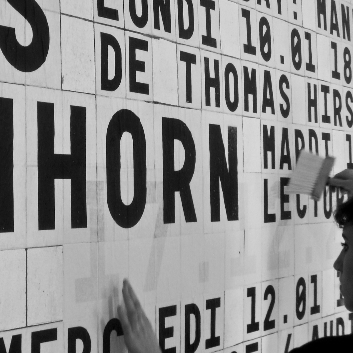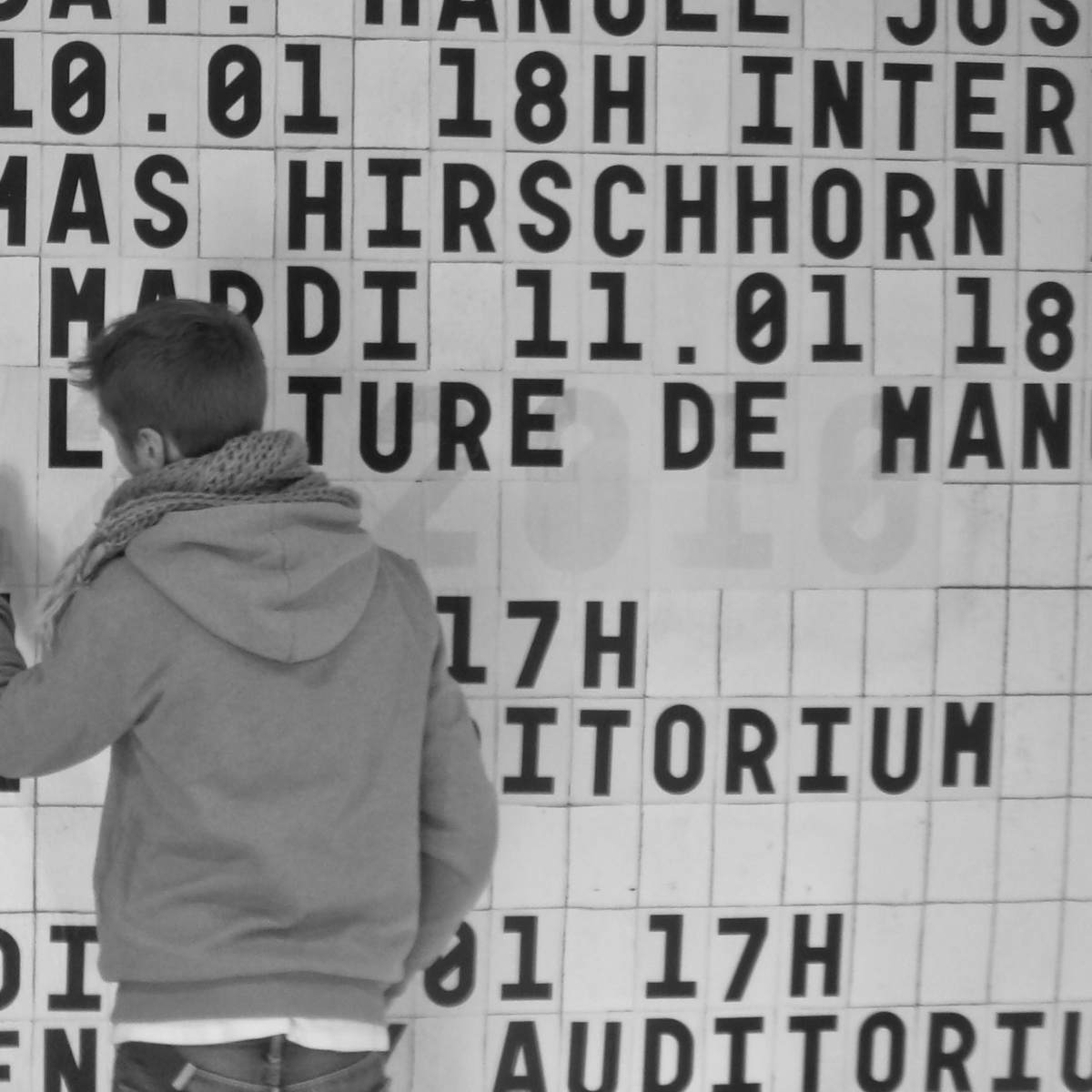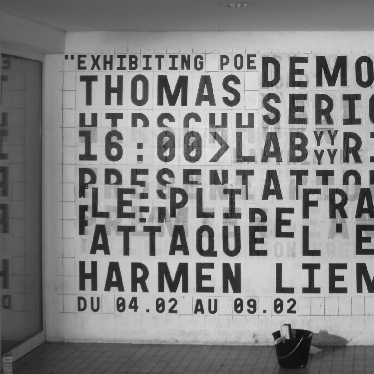 At the School of Fine Arts in Besançon [now known as Institut supérieur des beaux-arts de Besançon], with my colleague Rainer Oldendorf, we convened a group of first year students for the creation of a display wall. We used Garaje 0503 Monospace, designed for the school’s visual identity. Each glyph was photocopied in two sizes, A4 and A6. A grid of 750 A6 boxes was drawn on the wall, which Rainer with Gilles Picouet engraved. This physical grid allowed, throughout the year, the weekly collage of all the school’s news messages.