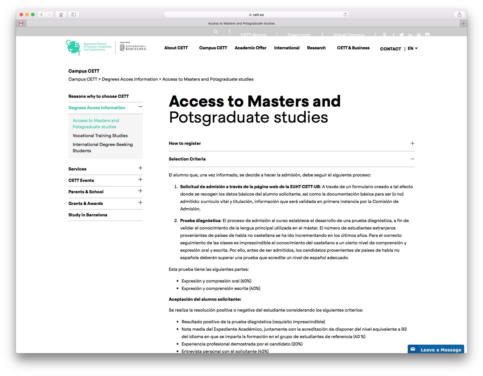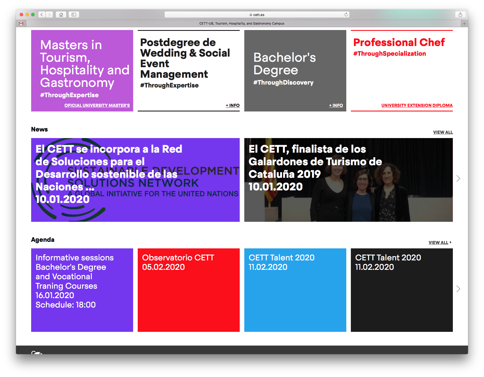 CETT is the Tourism, Hospitality and Gastronomy leading university in Barcelona and has been so since 1969. After 50 years of growth and evolution, it naturally reached a turning point. Amongst its closest competitors CETT stands out for many reasons. They are the only centre to fully embrace the economy of experiences, offering in turn the widest range of fields of study. All their degrees and certification courses are at the very centre of this trend: Tourism, Hospitality and Gastronomy.