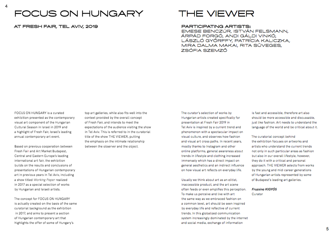 The curator’s selection of works by Hungarian artists created specifically for presentation at Fresh Fair 2019 in Tel Aviv is inspired by a current trend and phenomenon with a spectacular impact on visual culture, and observes how fashion and visual art cross paths. In recent years, mostly thanks to Instagram and other online platforms, general awareness about trends in lifestyle and clothing increased immensely which has a direct impact on general aesthetics and an indirect influence on how visual art reflects on everyday life.