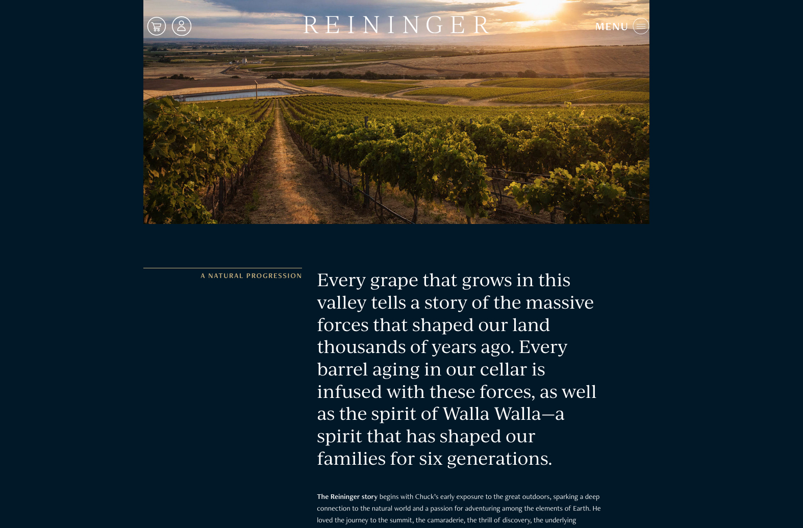 Reininger Winery, located in the heart of the Walla Walla Valley, Eastern Washington, specializes in crafting elegant and finely structured red wines from hand-harvested, ultra premium grapes. From the first release in 1997, Reiniger wines have possessed a unique quality derived from the winemaker’s awareness of and passion for the natural elements that make great wines. For its branding, IvyJournal has been chosen for headlines and is combined nicely with Freight Neo for text.